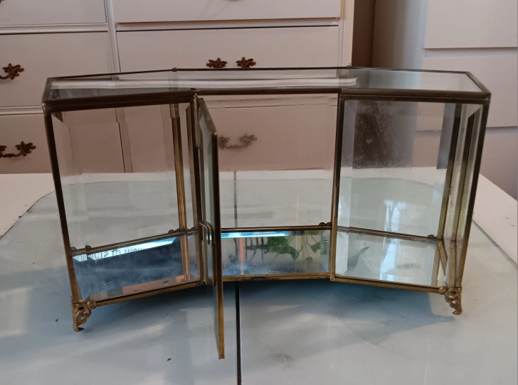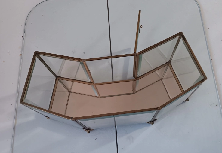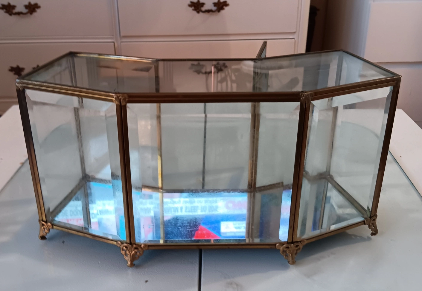 1000+Unique curved glass display case. Brass framing and feet. Three sections. Hinged centre panel. Ideal for jewellery or collectibles.