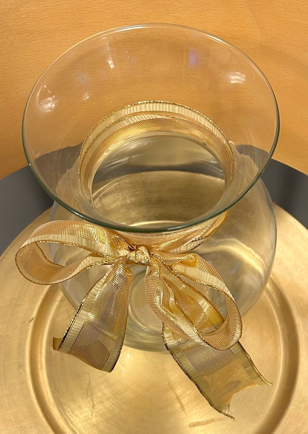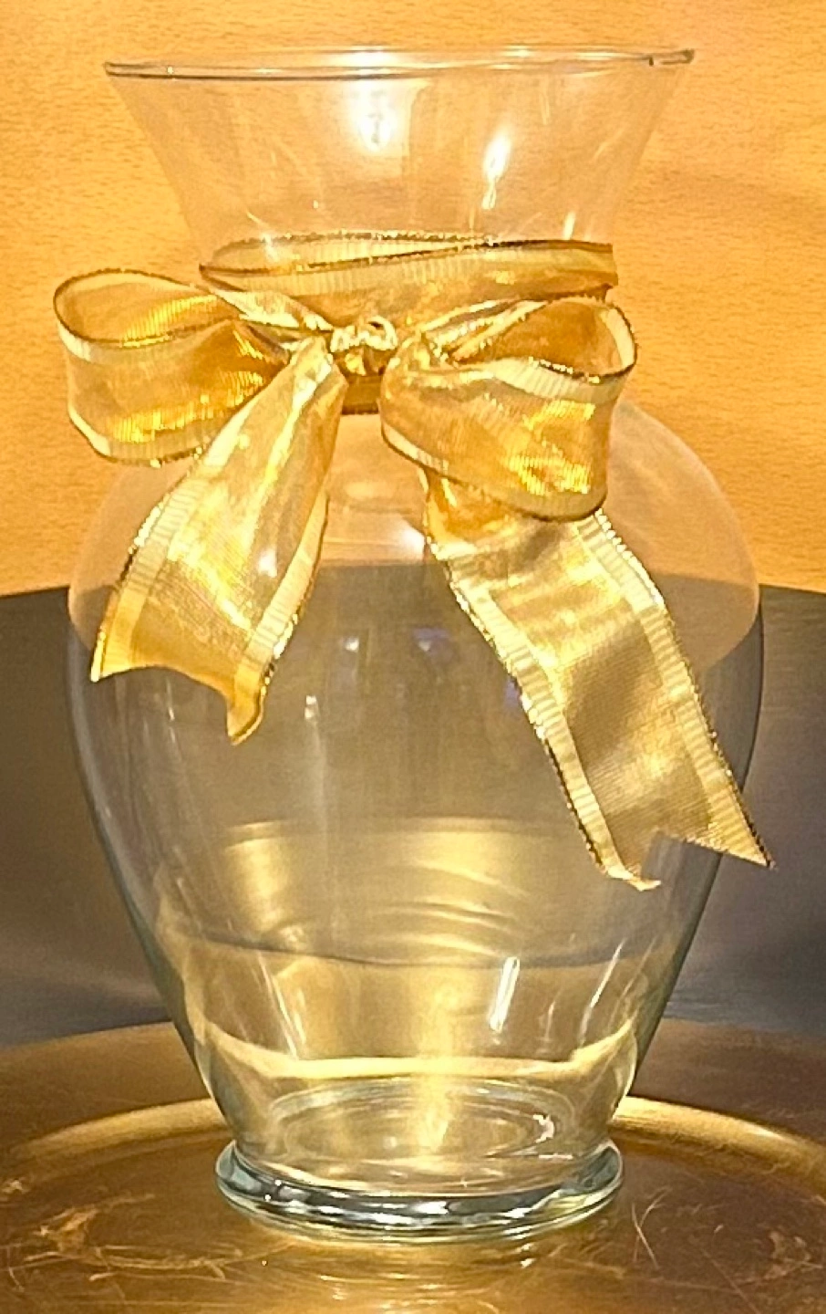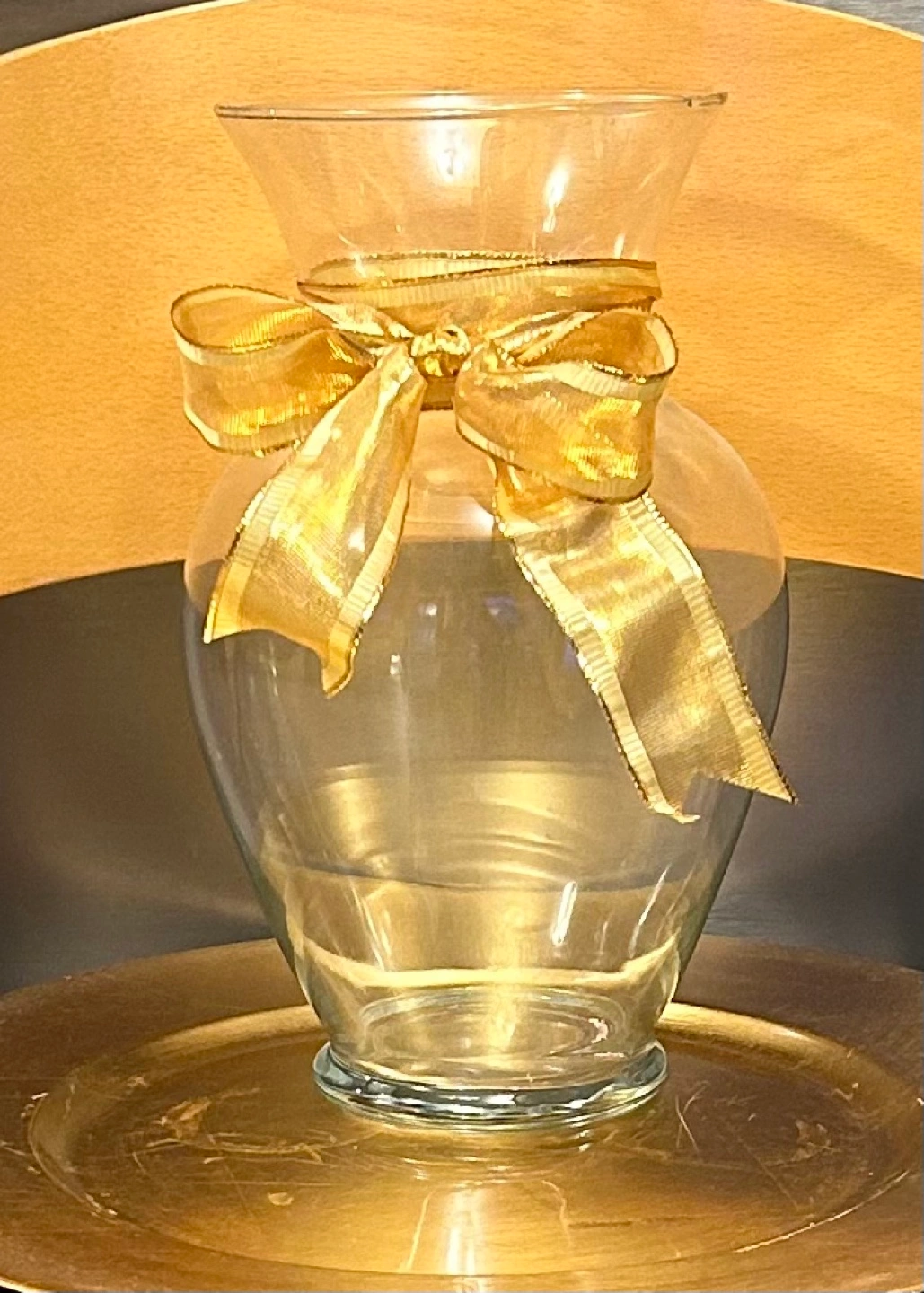 310Beautiful clear glass vase. Perfect for displaying flowers or as a decorative accent. Features a wide mouth and a gently curving body. Adorned with a gold ribbon. Height 11” 😊 Pick up location Northeast Burlington Intersection Appleby line and Dundas Contact free porch pick up Smoke free home