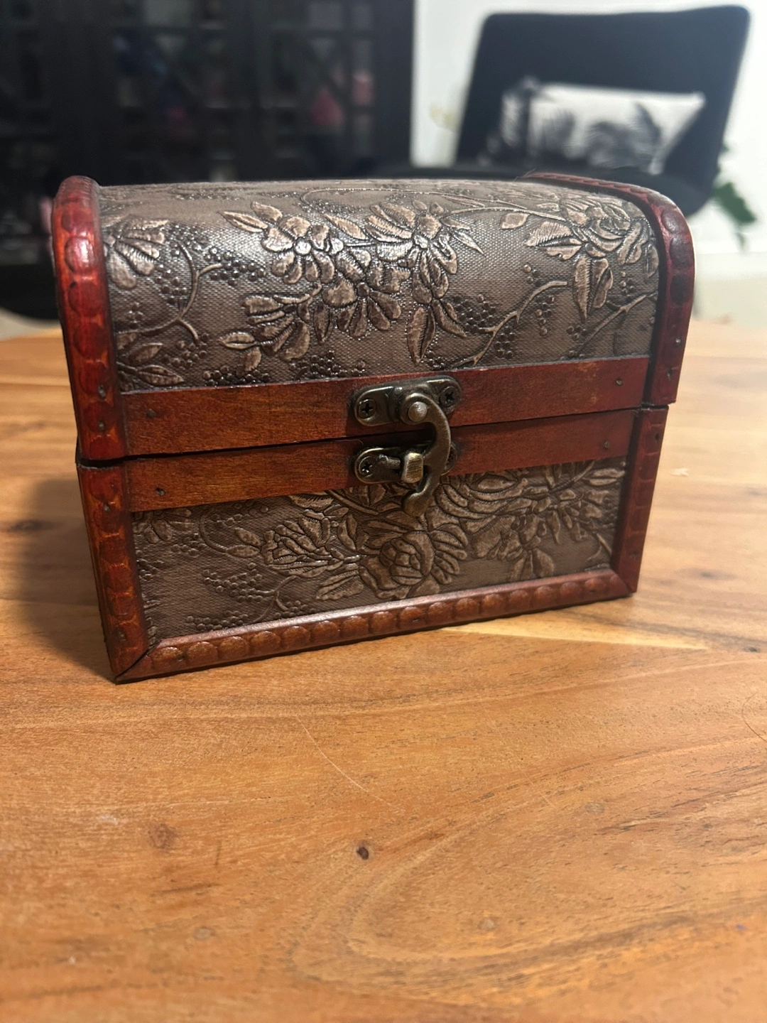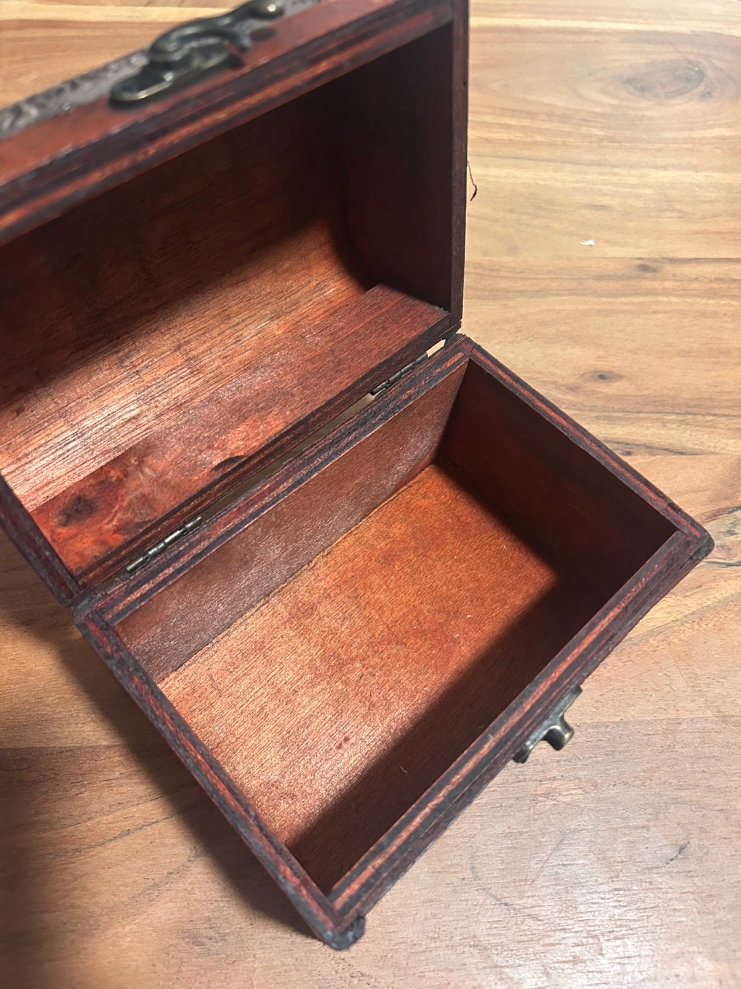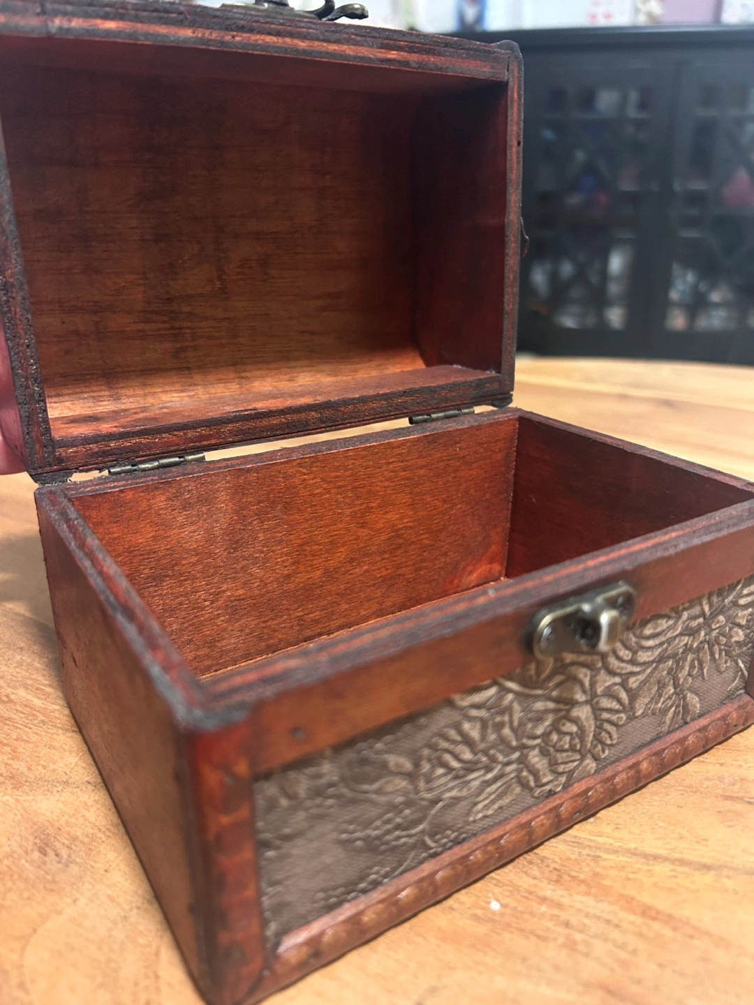 Small decorative wooden box. Features a floral design on the lid. Perfect for storing small items or jewellery. Has a hinged lid and clasp closure.