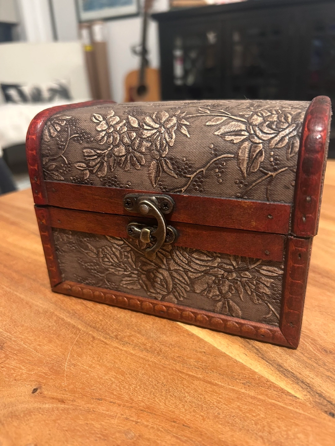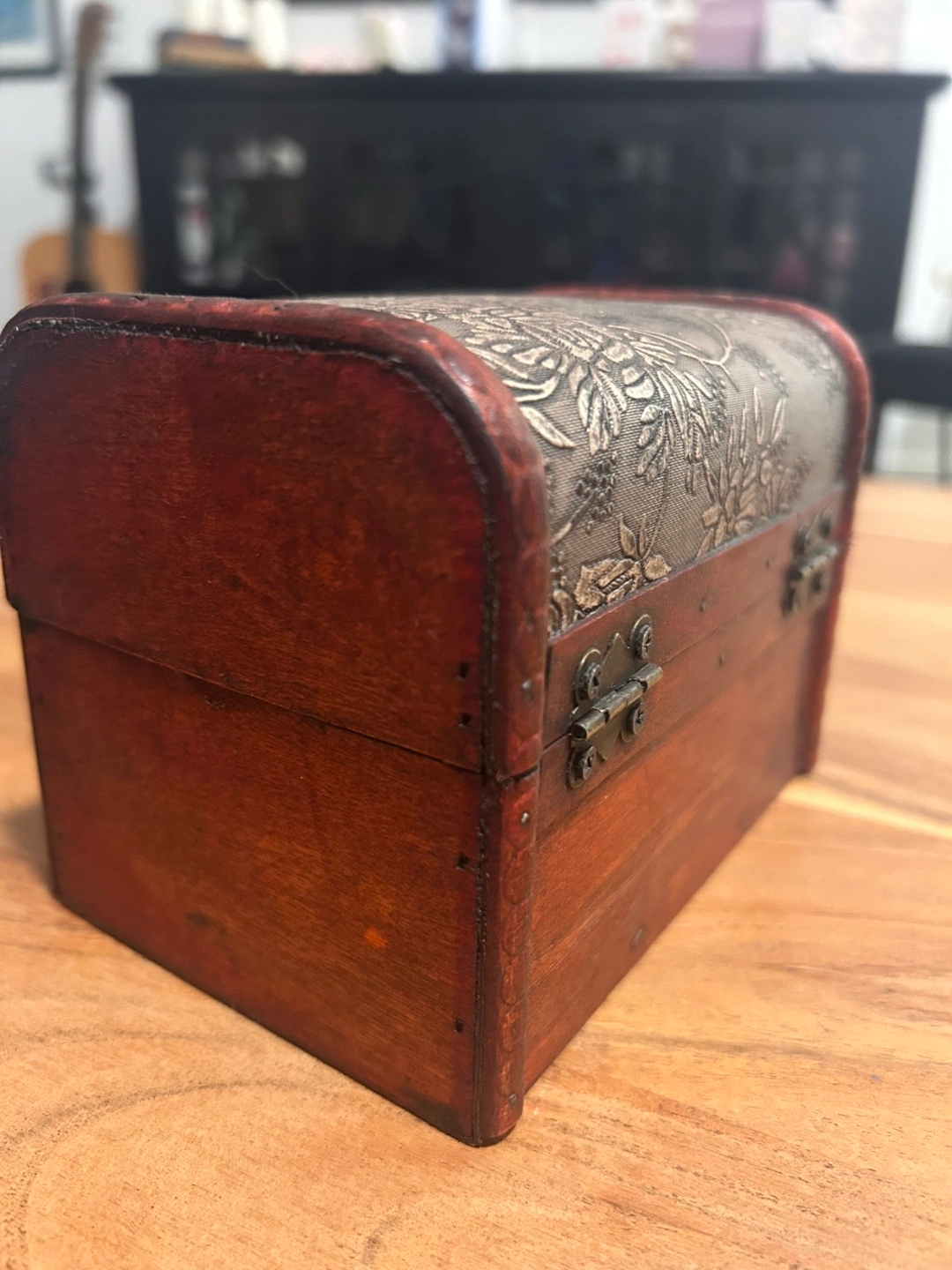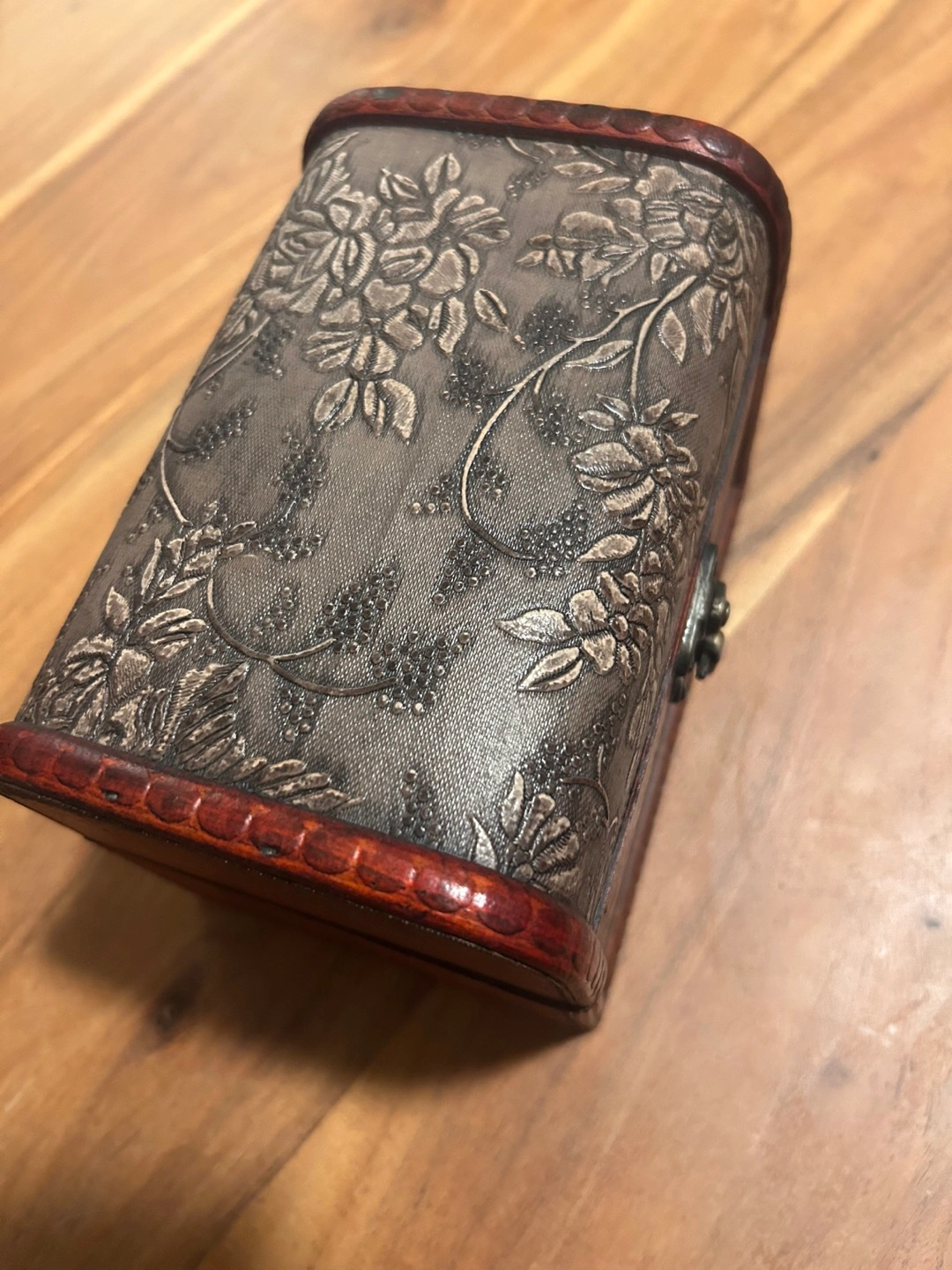 Small decorative wooden box. Features a floral design on the lid. Perfect for storing small items or jewellery. Has a hinged lid and clasp closure.