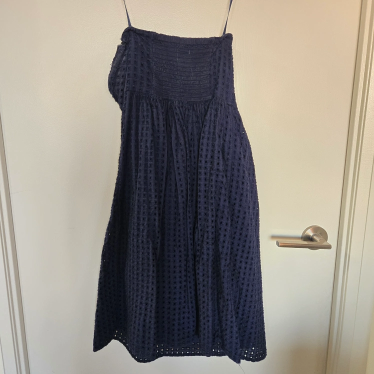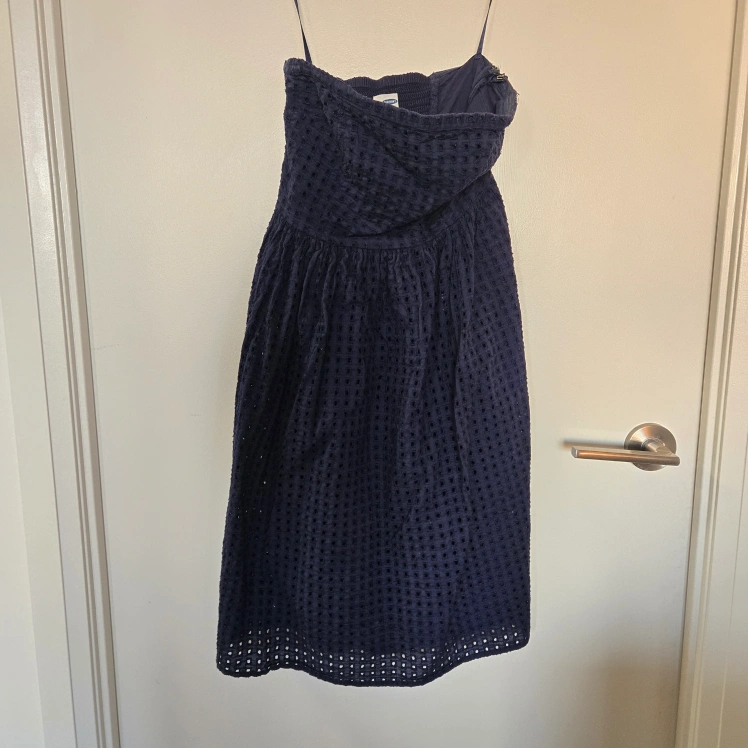 Beautiful navy blue eyelet midi dress. Strapless design. Great for summer events.