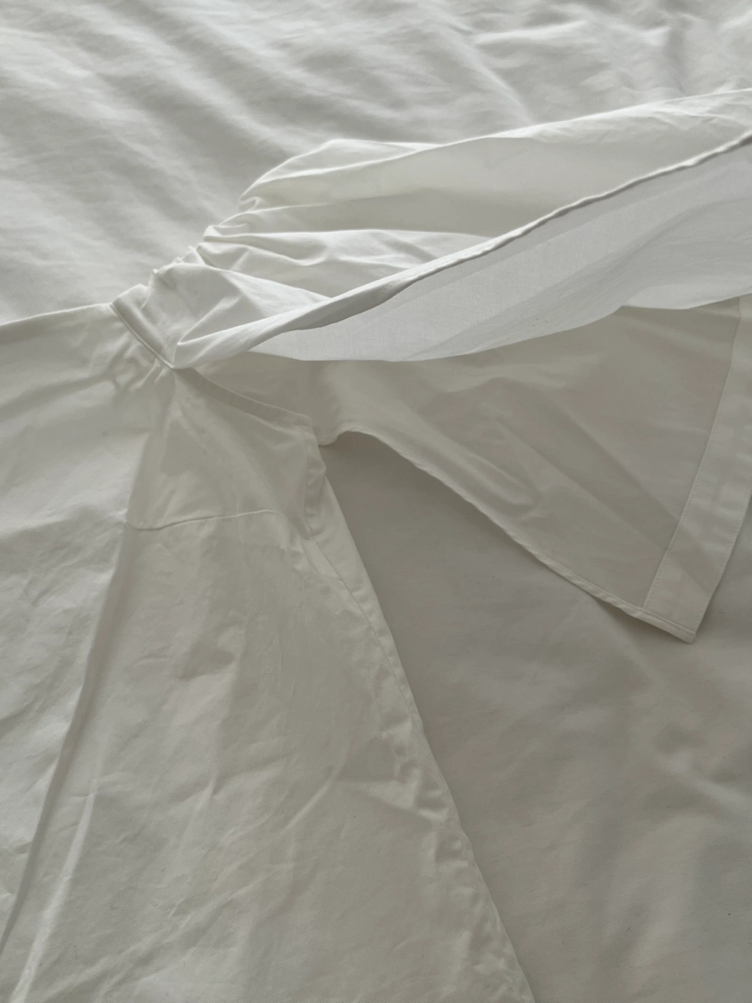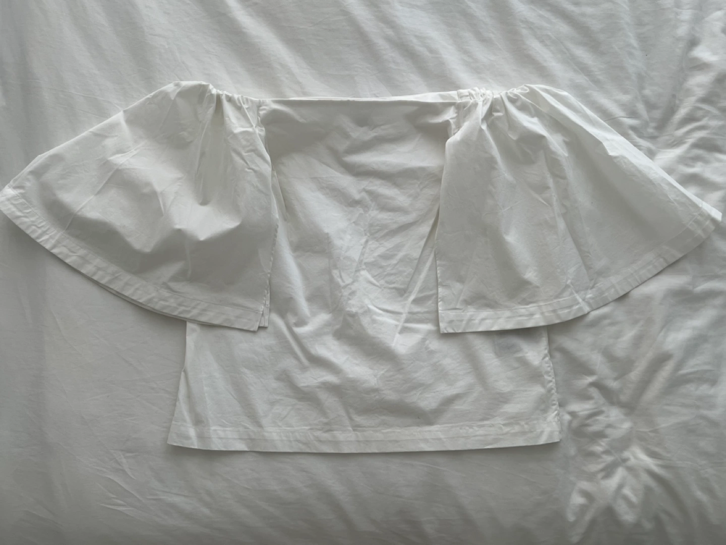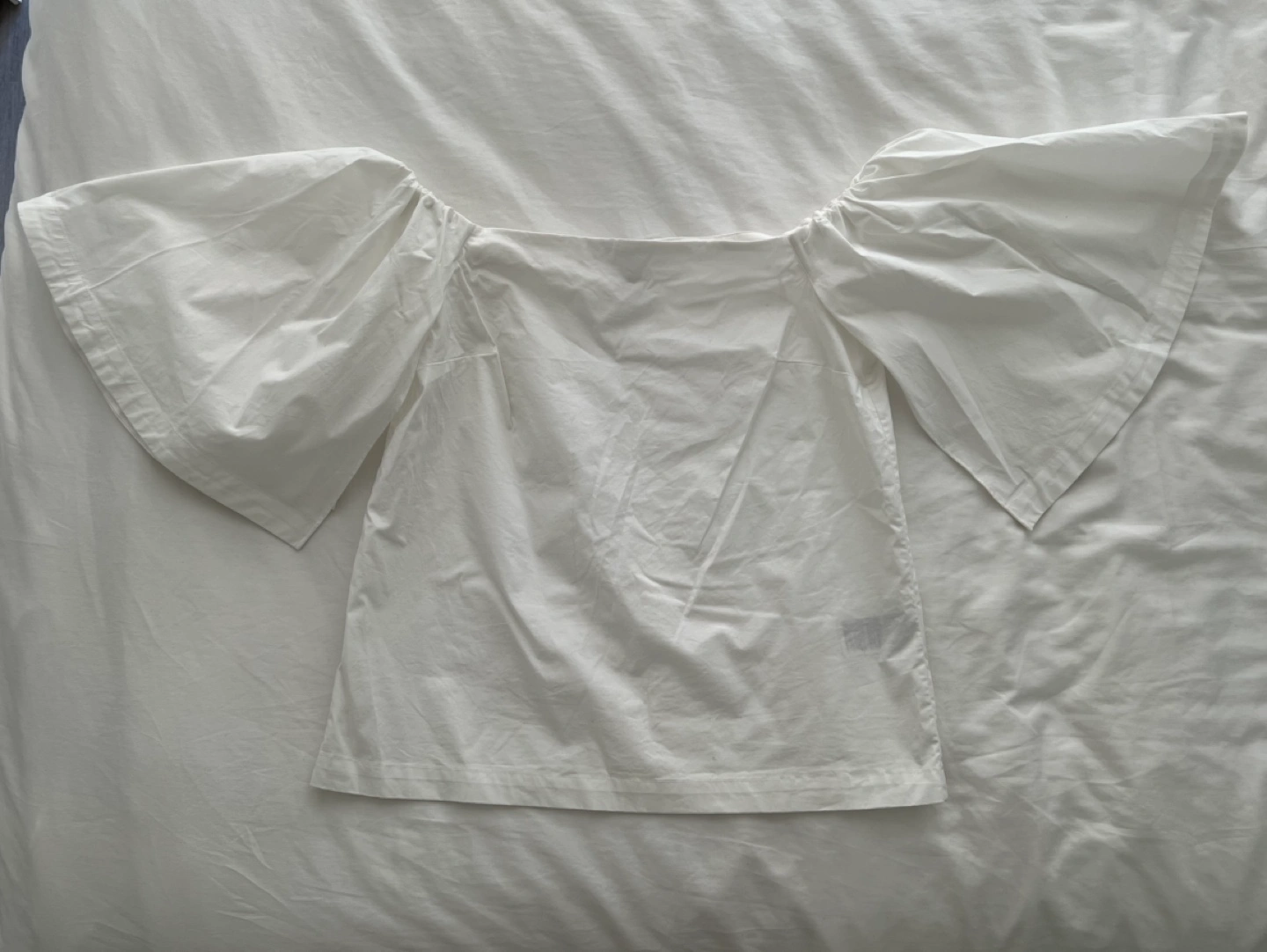 Women's white off-the-shoulder blouse. Features puff sleeves and a gathered neckline. Covers arms and flattering the shape. Made of a cotton-like material. Size XS/P.
