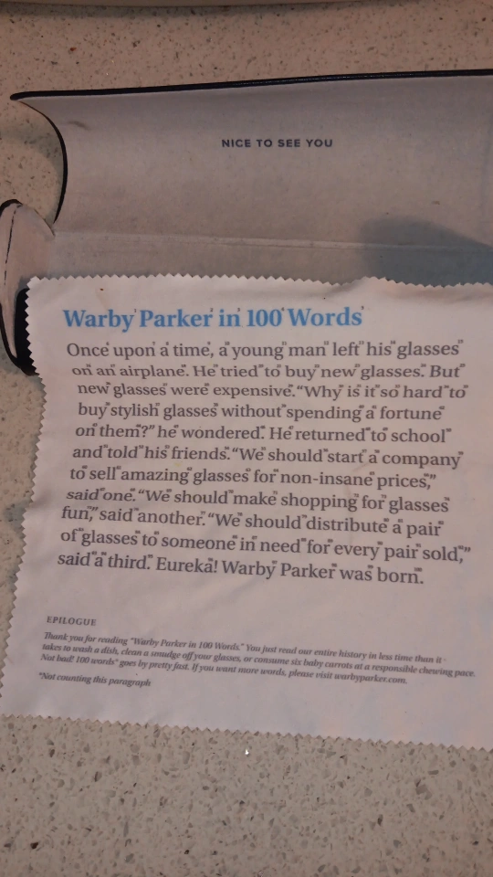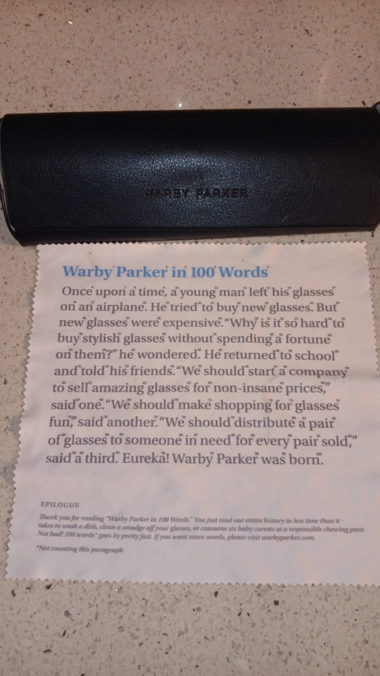 Like new Warby Parker Eyeglasses case & cleaning cloth. Includes brand story on cloth.perfect collectors item
