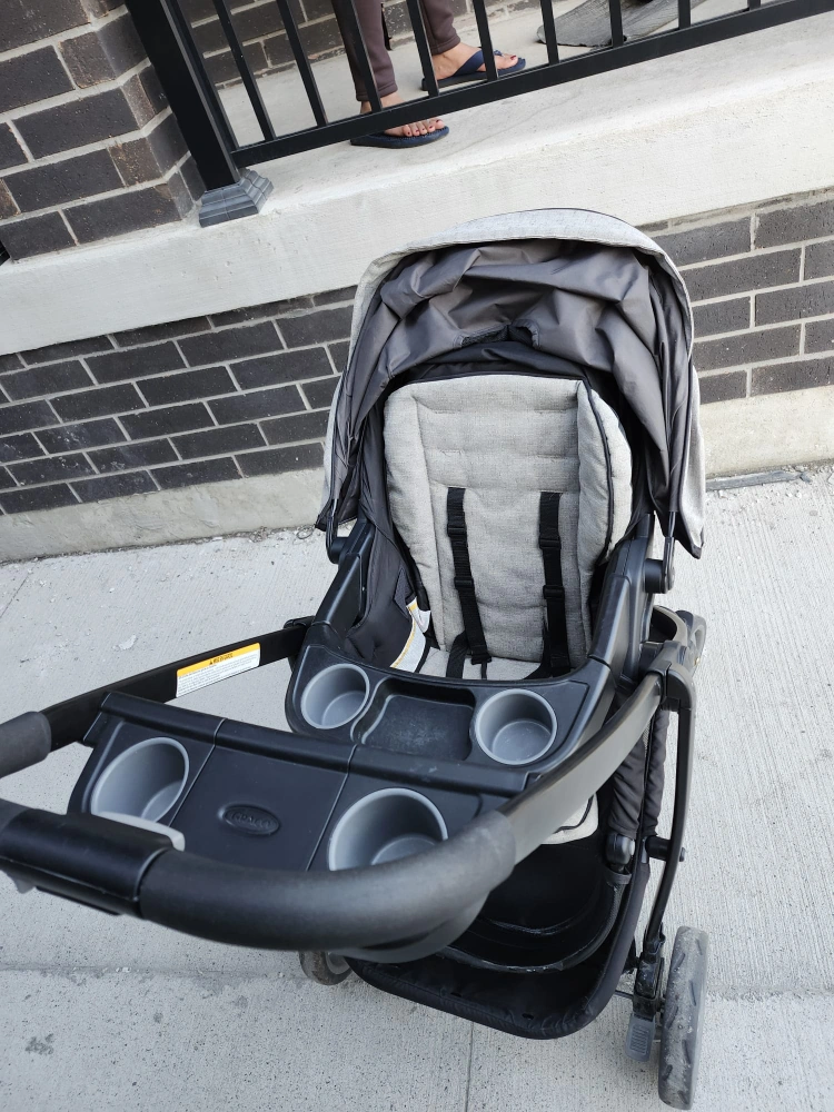 Lightweight stroller, easy to fold and unfold. Cup holders included. Grey and black colour scheme. Suitable for infants and toddlers maybe even young children. Has infant car seat that's compatible. perfect if you have small space.