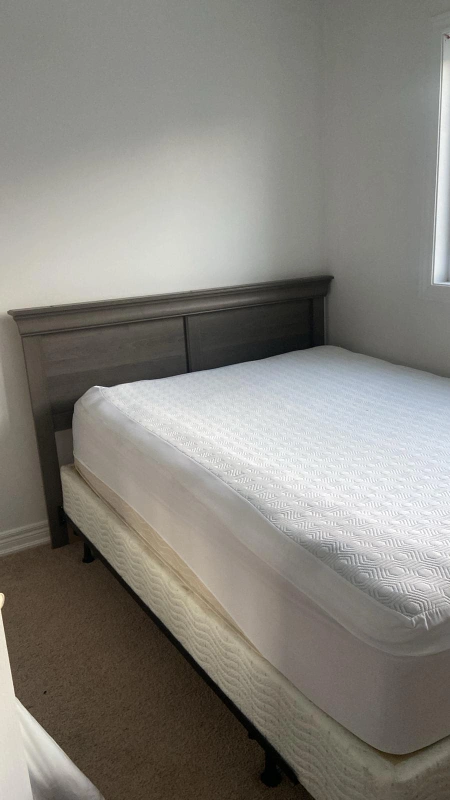 Queen bed frame, grey colour. Includes headboard, springbox and matress. . excellent condition. Solid wood. construction. Easy assembly.