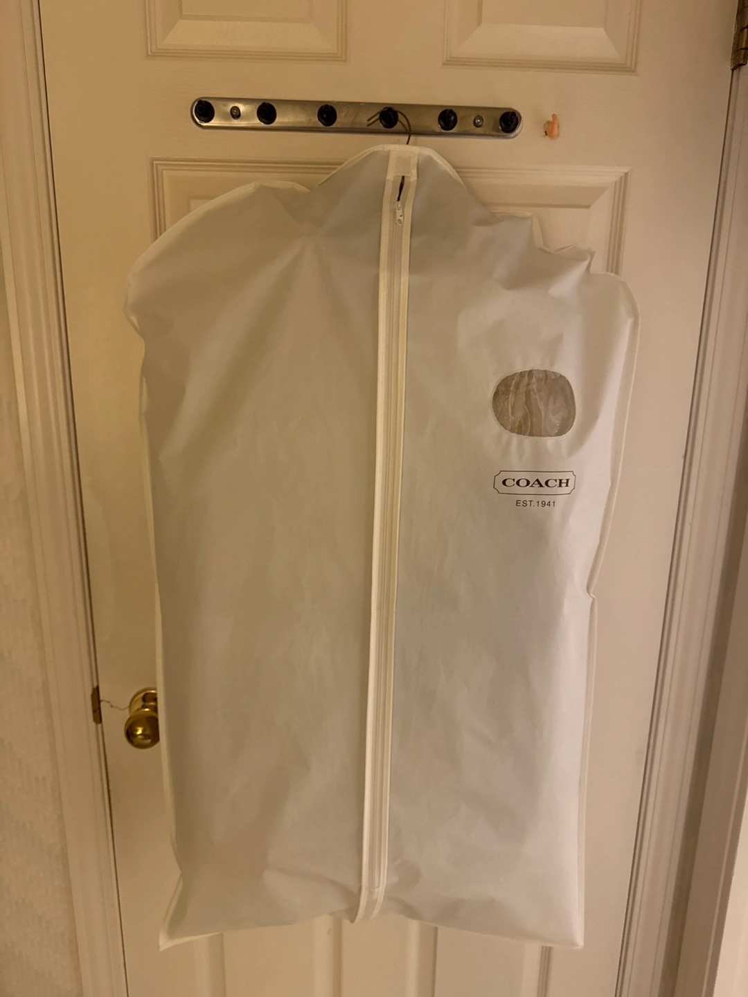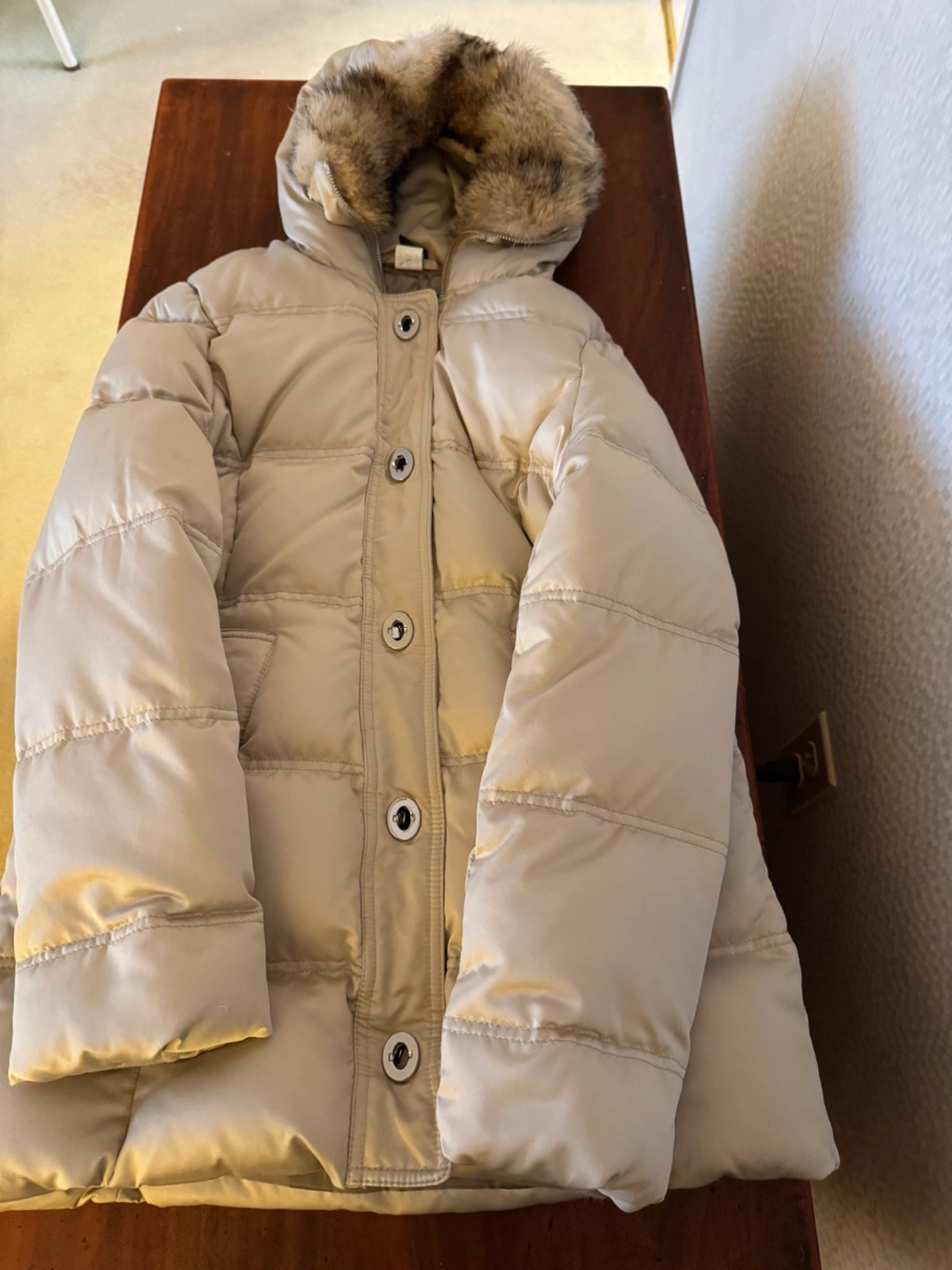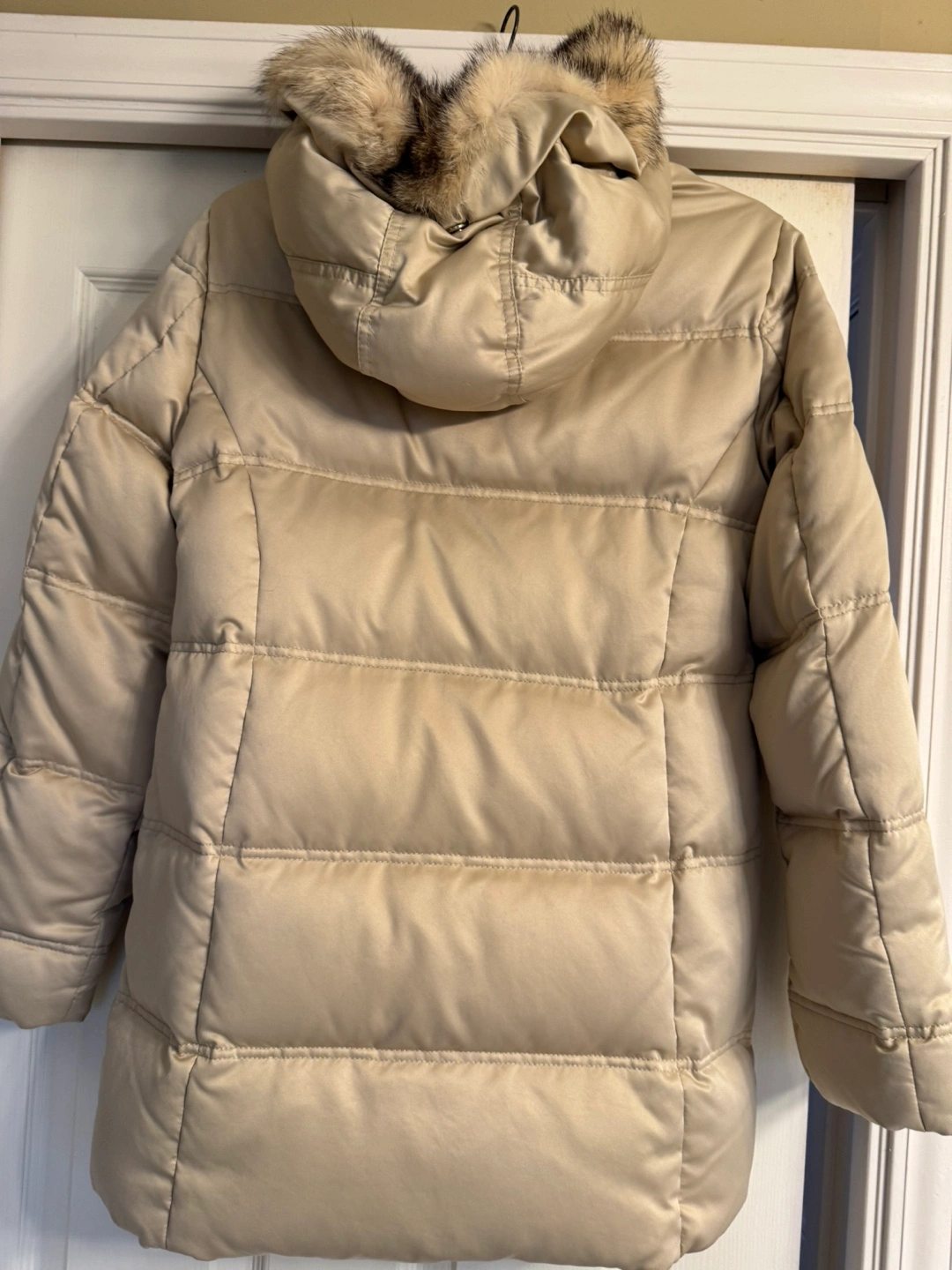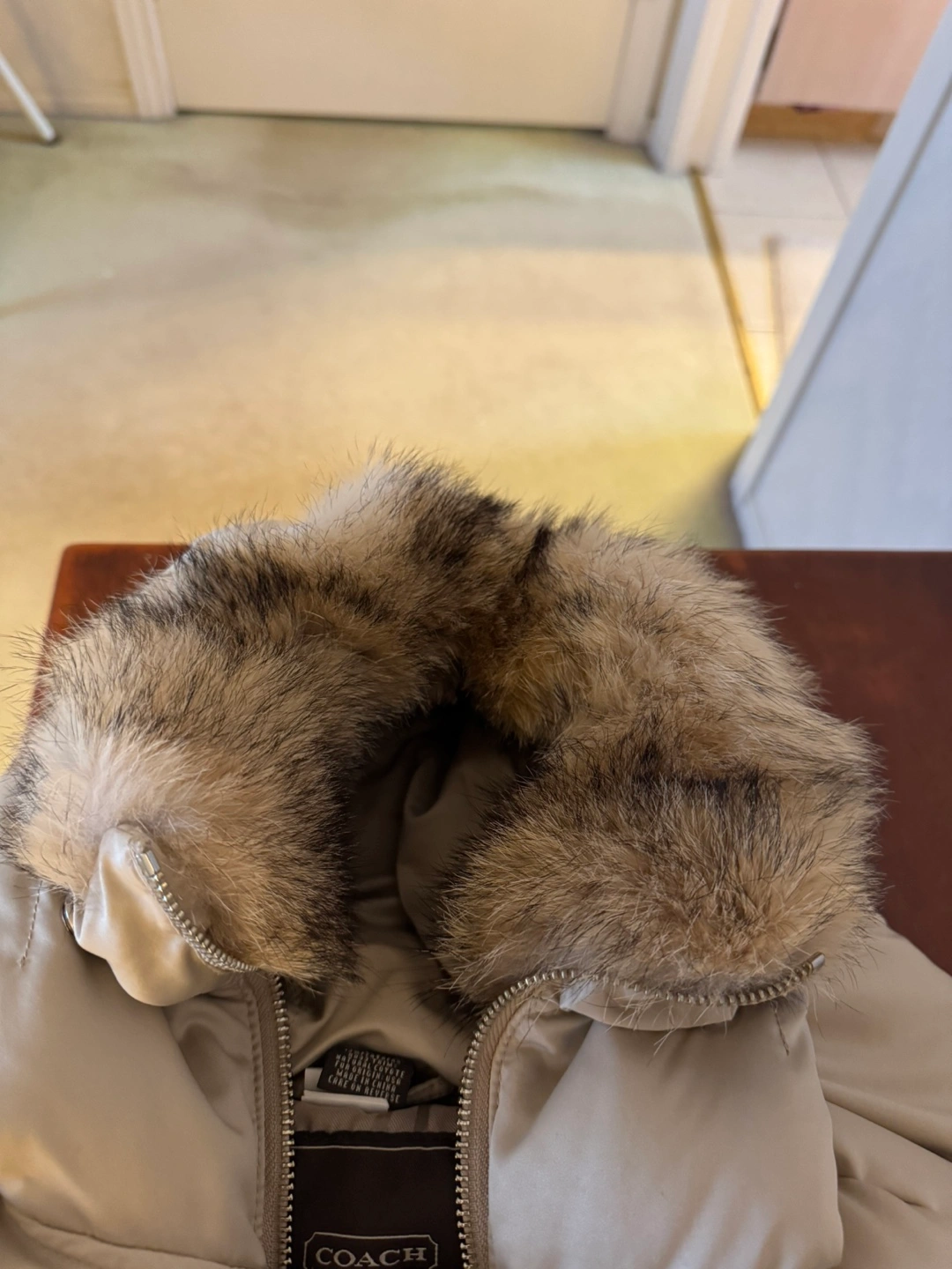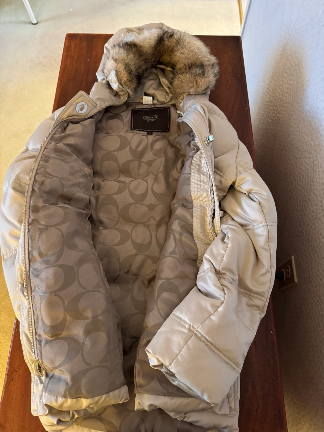 Women's COACH down jacket (90% down, 10% feathers). Features a fur trimmed hood. Comes with a garment bag. Zippered pockets.