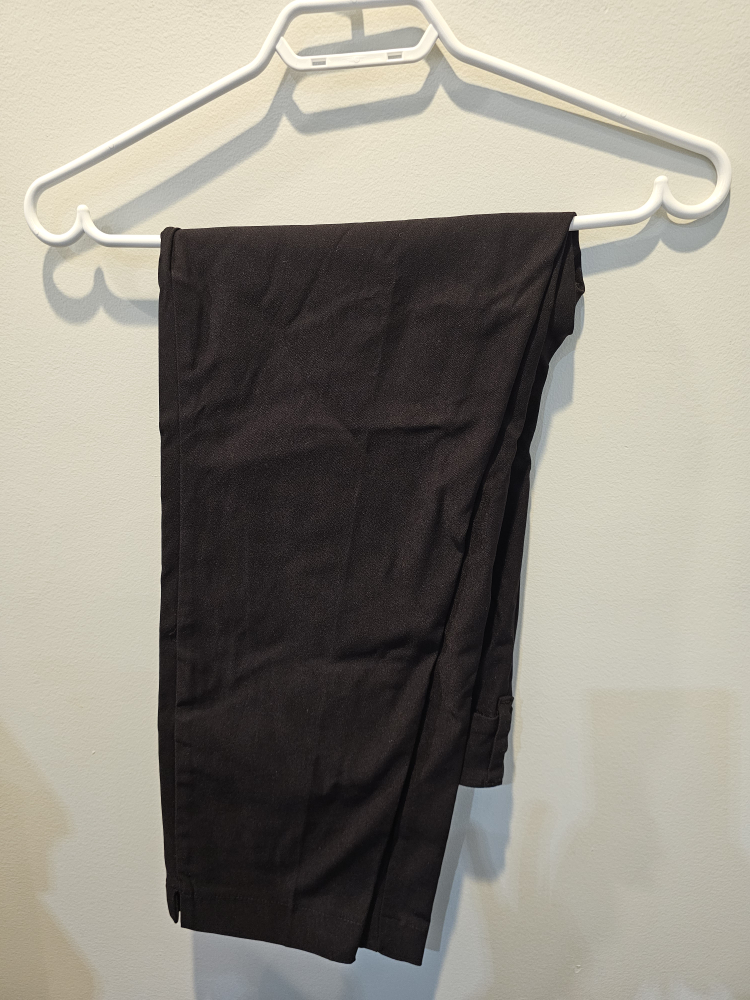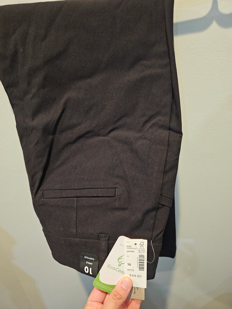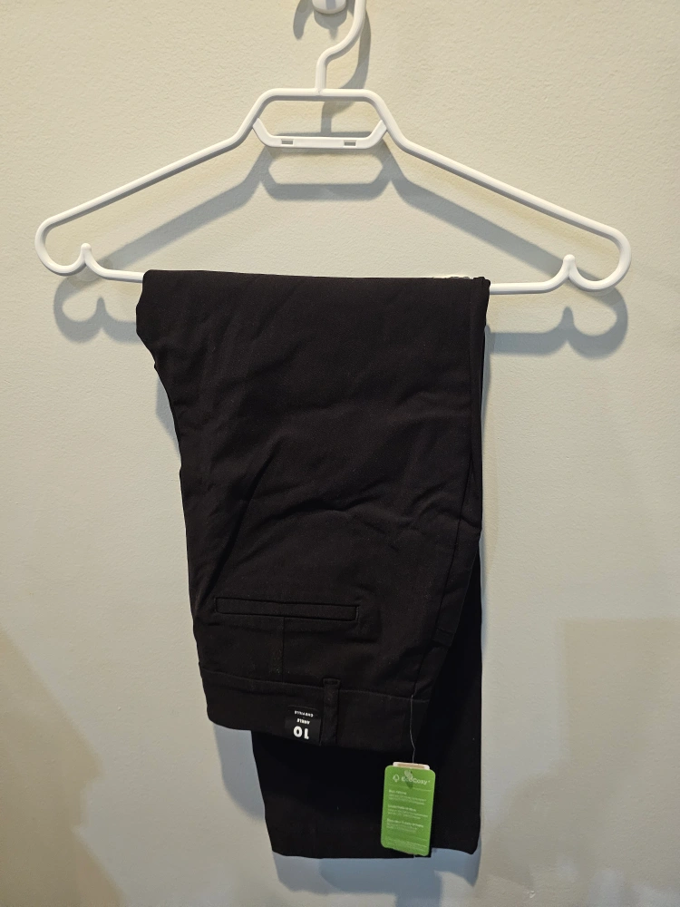 Black ankle pants, size 10. New with tags. Eco-conscious material. Perfect for work or casual wear. Flattering fit.
