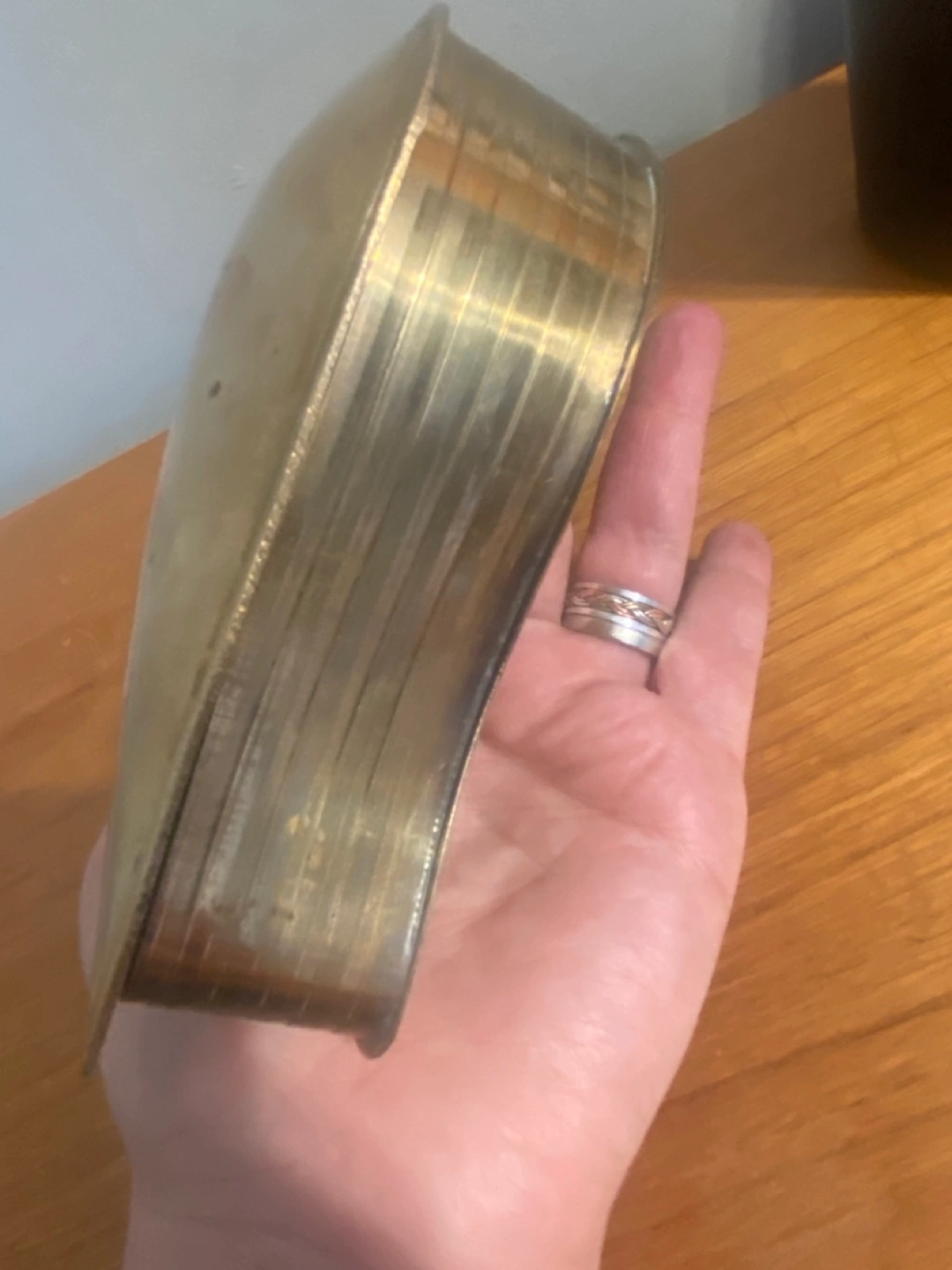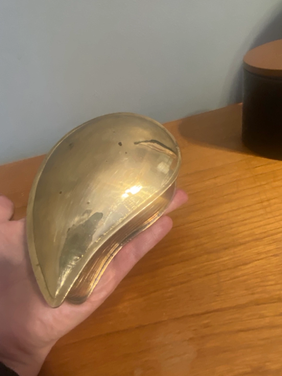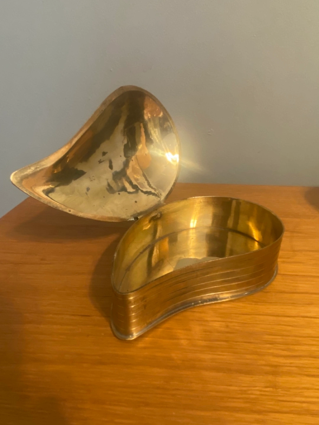 Unique brass trinket box. Tear drop- shaped design. Lidded container. Small size. Ideal for jewellery or other small items.