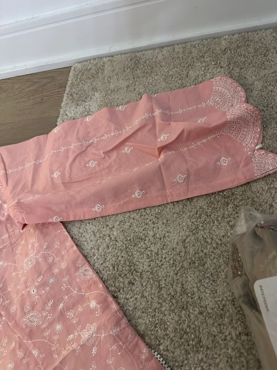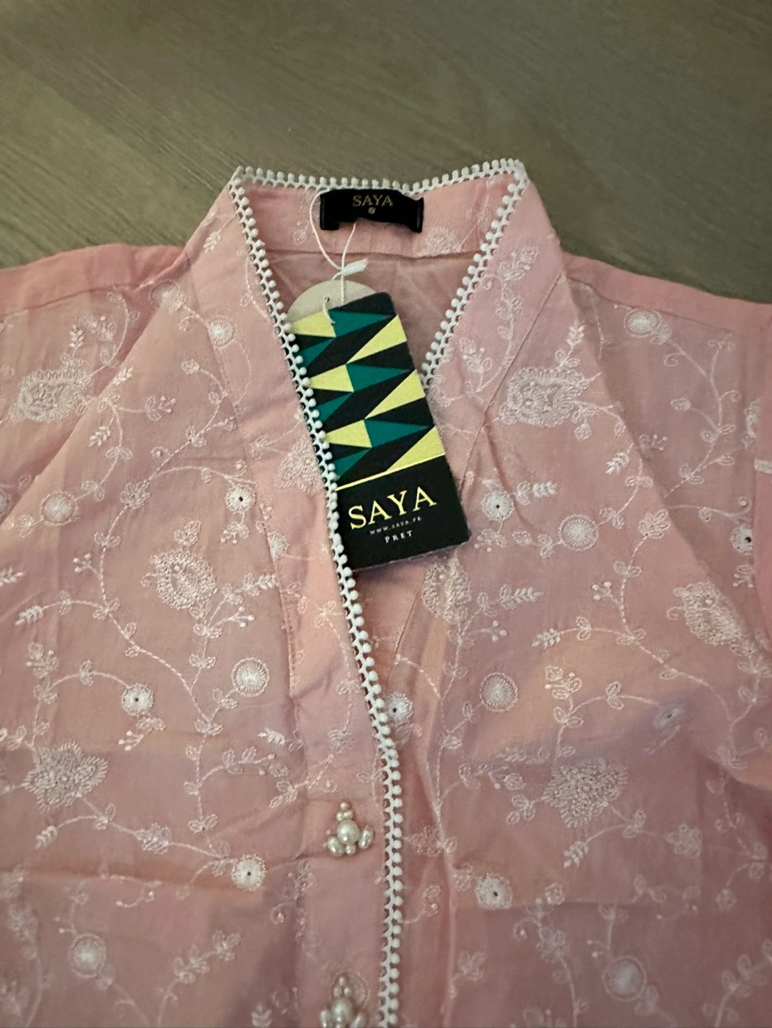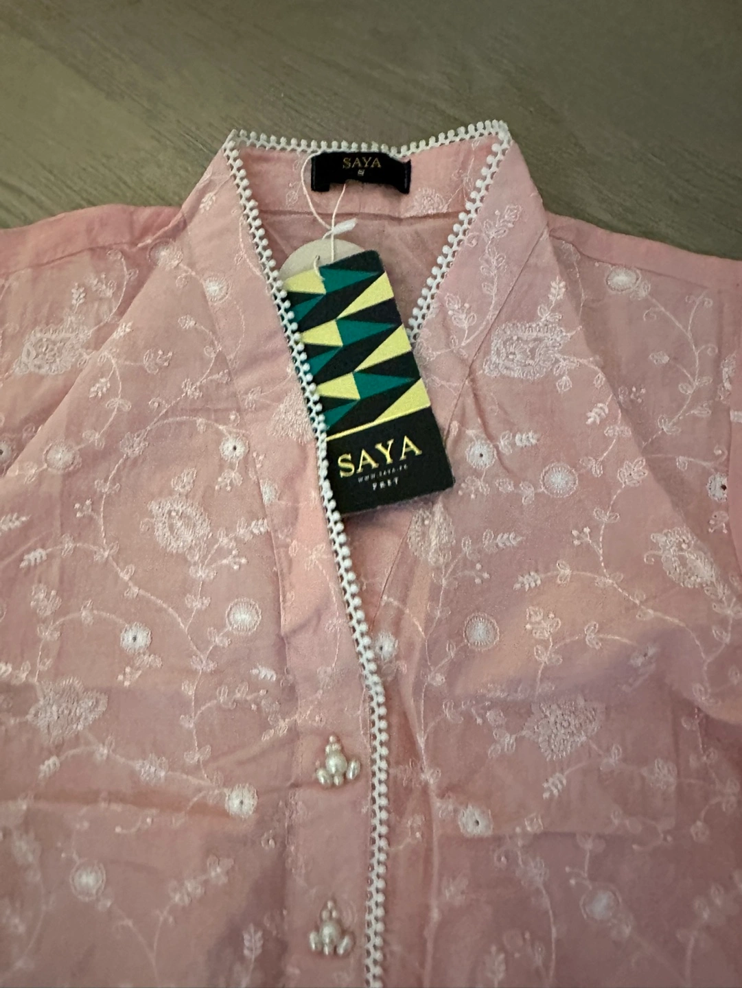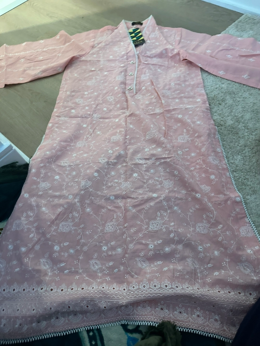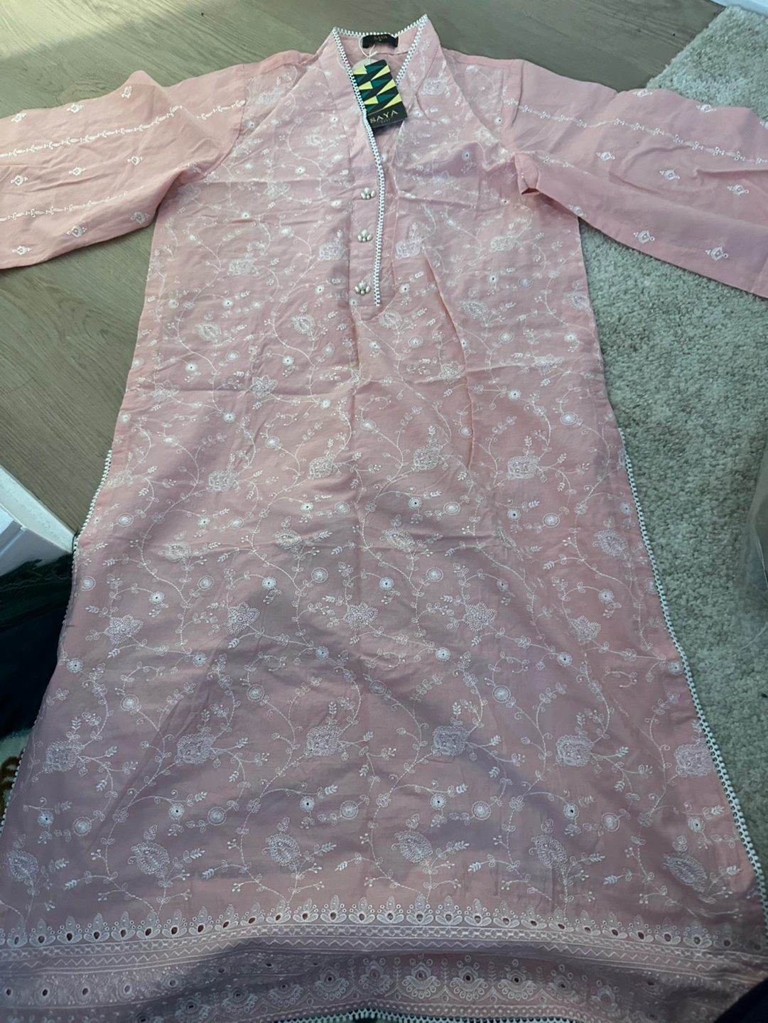 Beautiful pink embroidered kurta. Long sleeves, pearl buttons, and delicate embroidery. New with tags. trouser and dupatta included