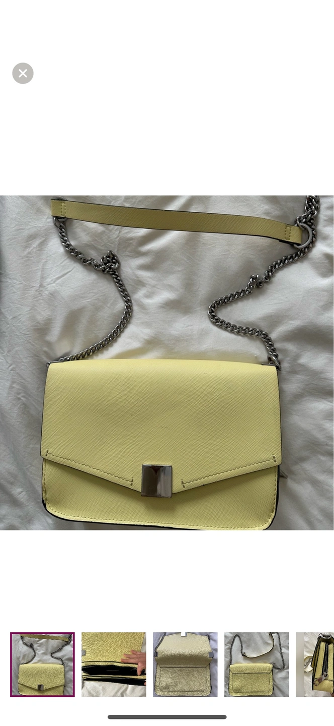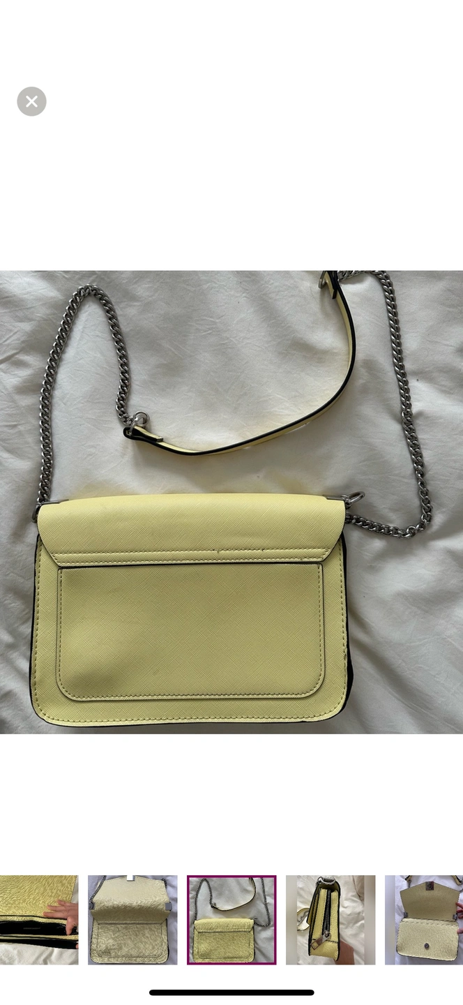 Yellow Zara purse with silver chain Some tarnishing on the metal, worn as shown but still usable! Two inside pockets and one outside pocket on the back Zipper closure