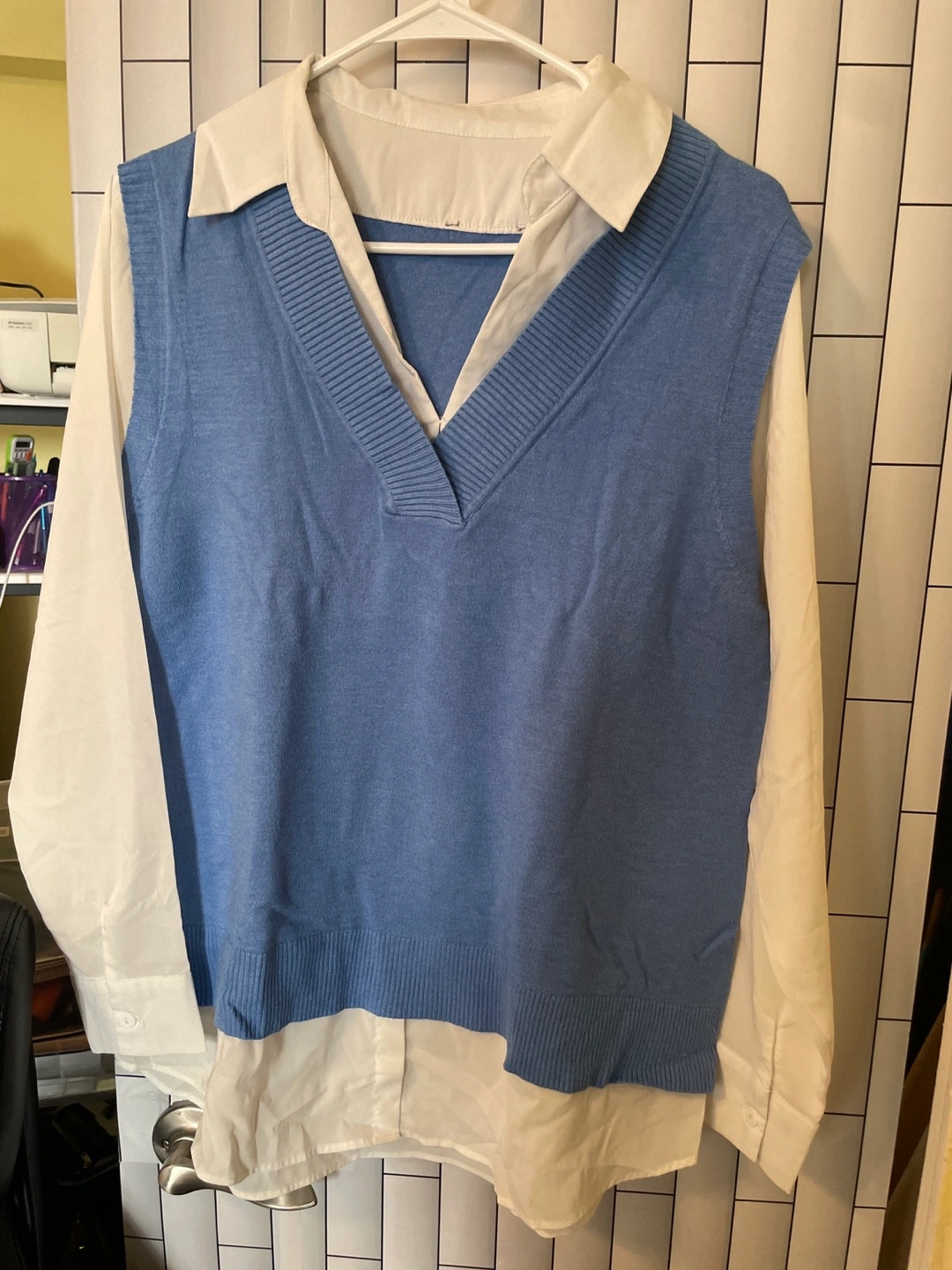 Adorable two-piece set. Features a light blue v-neck knit vest layered over a white button-up shirt. Perfect for fall and spring. Long sleeves. Casual style.