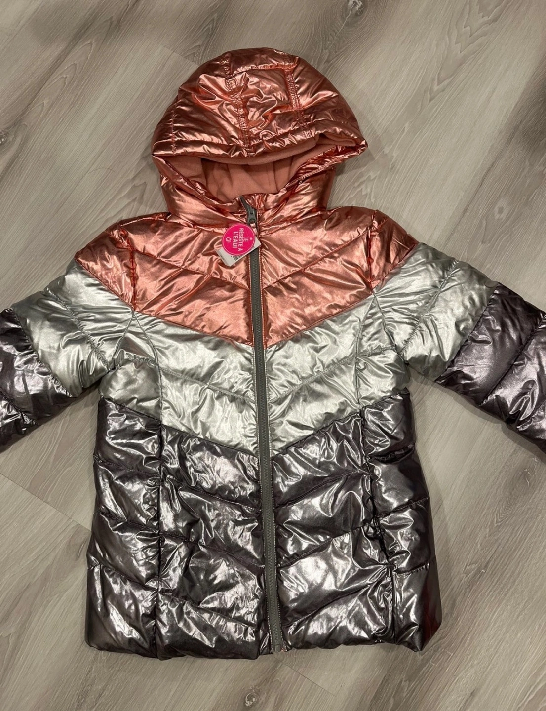Rose gold, silver, and grey colour block design. Hooded. Warm and stylish. New with tags.