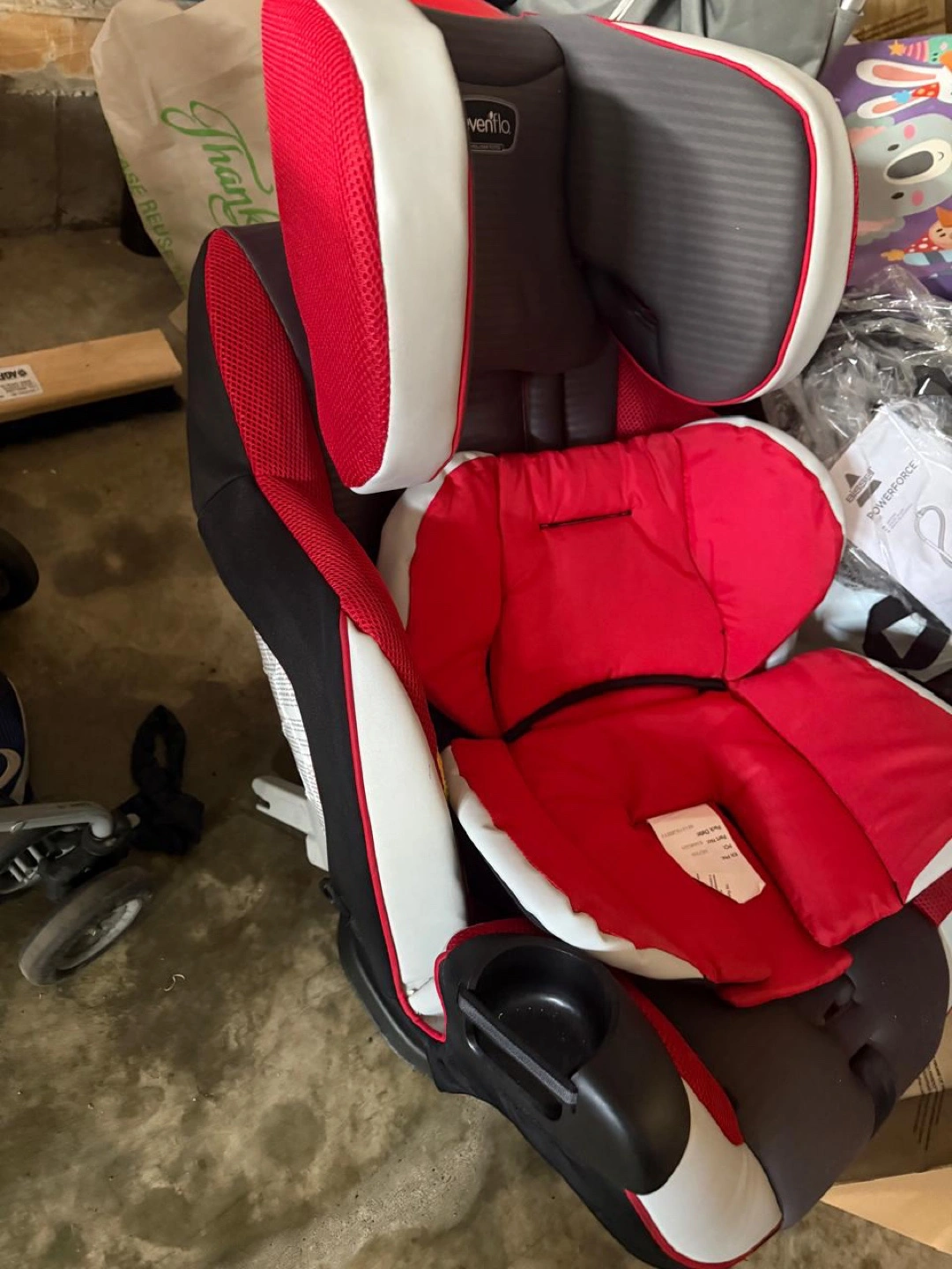 Used Evenflo car seat. Red and grey colour scheme. Features include rotation and multiple recline positions. Suitable for various ages and weights. Cup holder included.