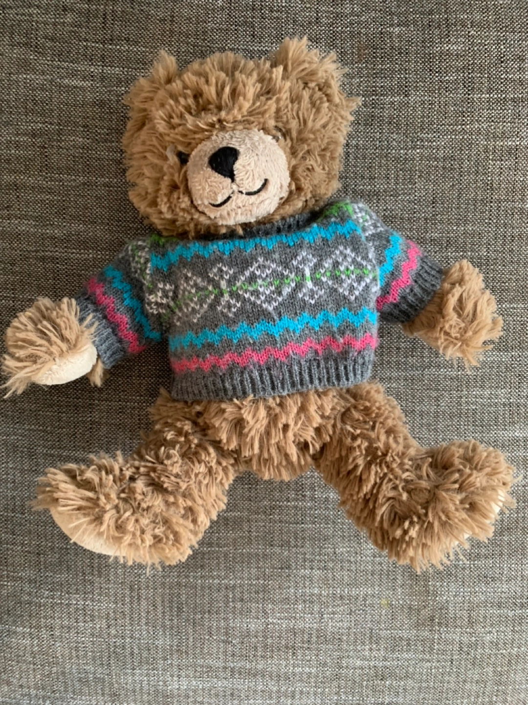 400Brown teddy bear wearing a patterned sweater. ***no holds FCFS*** ***pick up only***
