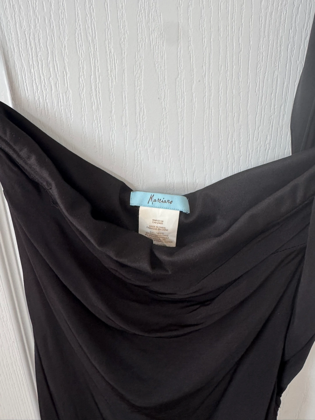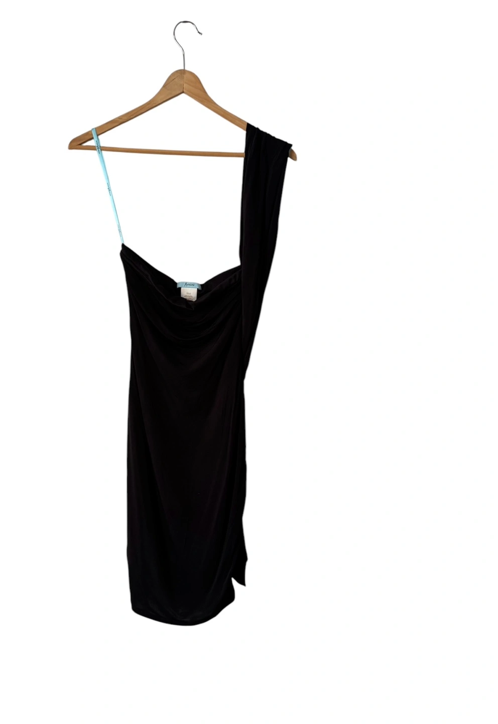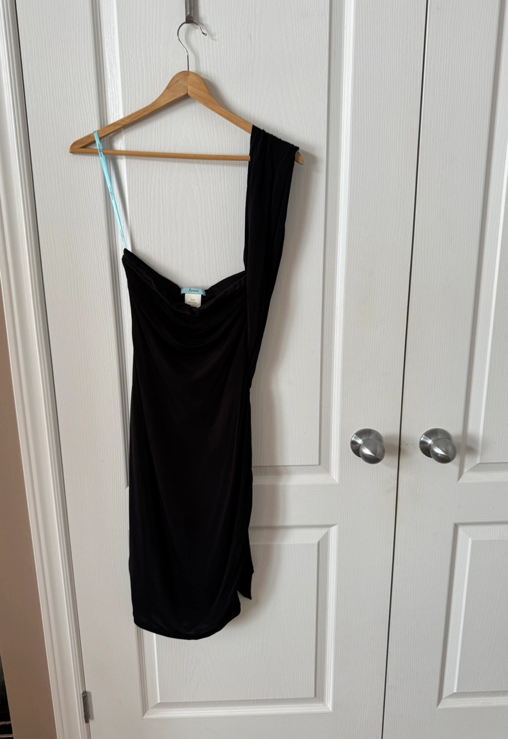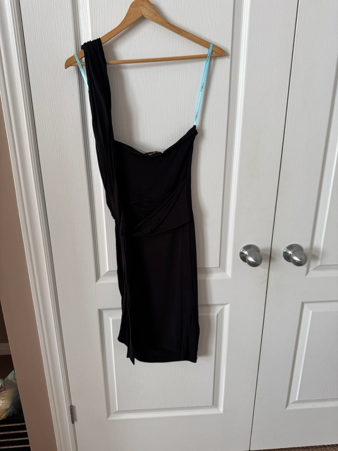15Black mini dress. One shoulder design. Draped neckline. Form-fitting silhouette. Great for a night out.