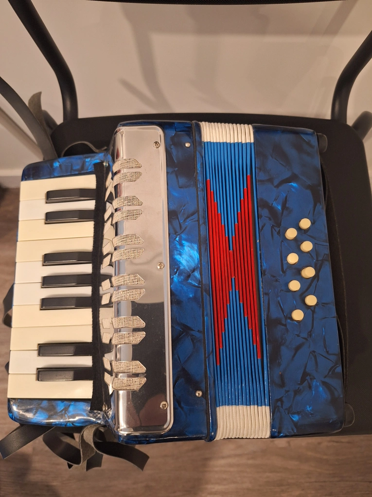 Small, blue accordion. Features a metallic silver section and white and blue bellows. Good for beginners.Lots of fun.