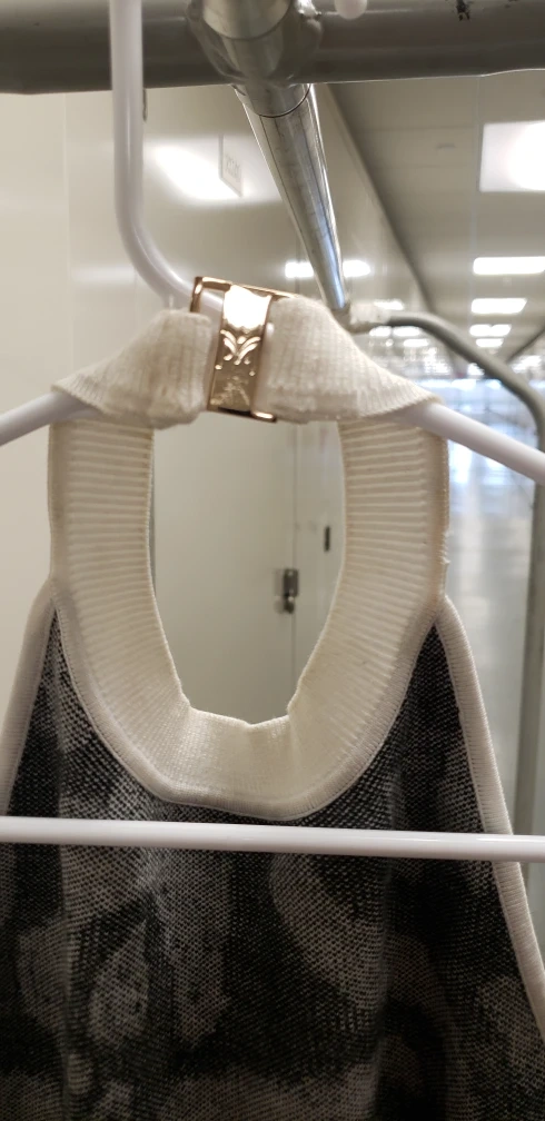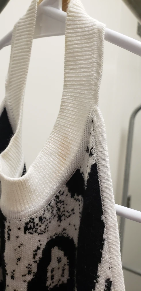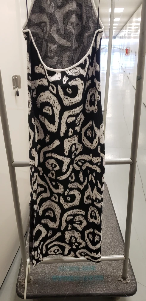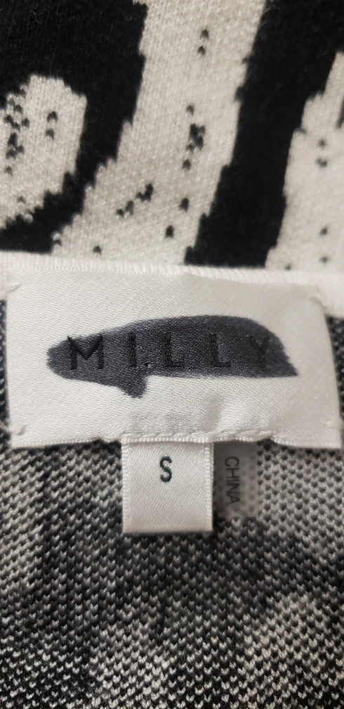 Women's Milly size small black and white Intasia abstract print knit halter midi dress. Features a gold clasp at the neckline. Slight makeup discoloration on the neckline. Condition is returned, likely from Neiman Marcus. Retails for $400, great deal for $20, just needs a quick clean