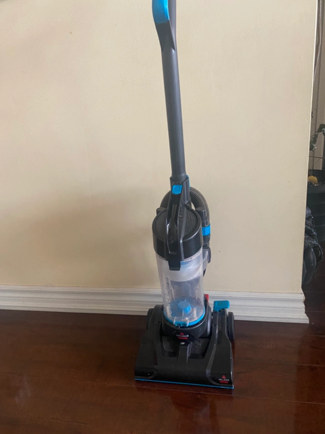 Lightweight and easy-to-use upright vacuum. Great for smaller spaces. Features a clear dust cup for easy emptying. Power cord included.