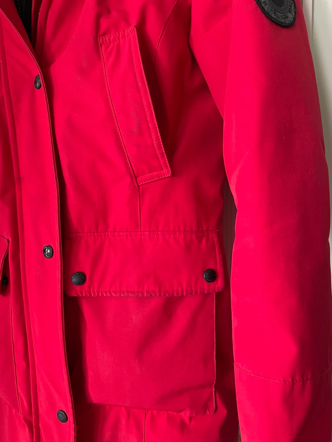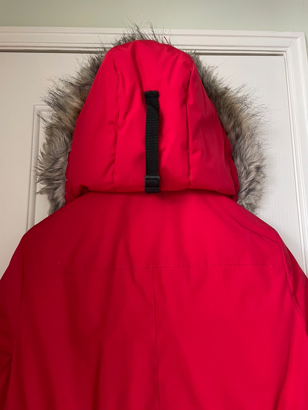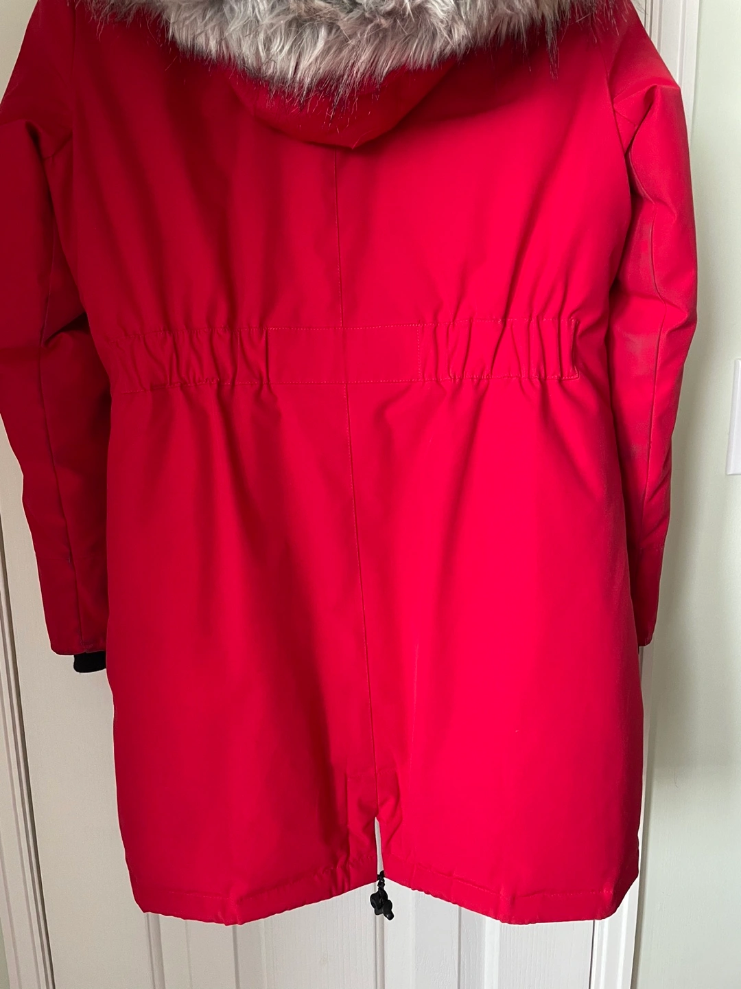 Women's red down parka. Features a detachable faux fur-trimmed hood, inner pocket cell phone holder, multiple outer pockets and upper hand warmer pockets. Zipper and button closure with inner drawstring waist.