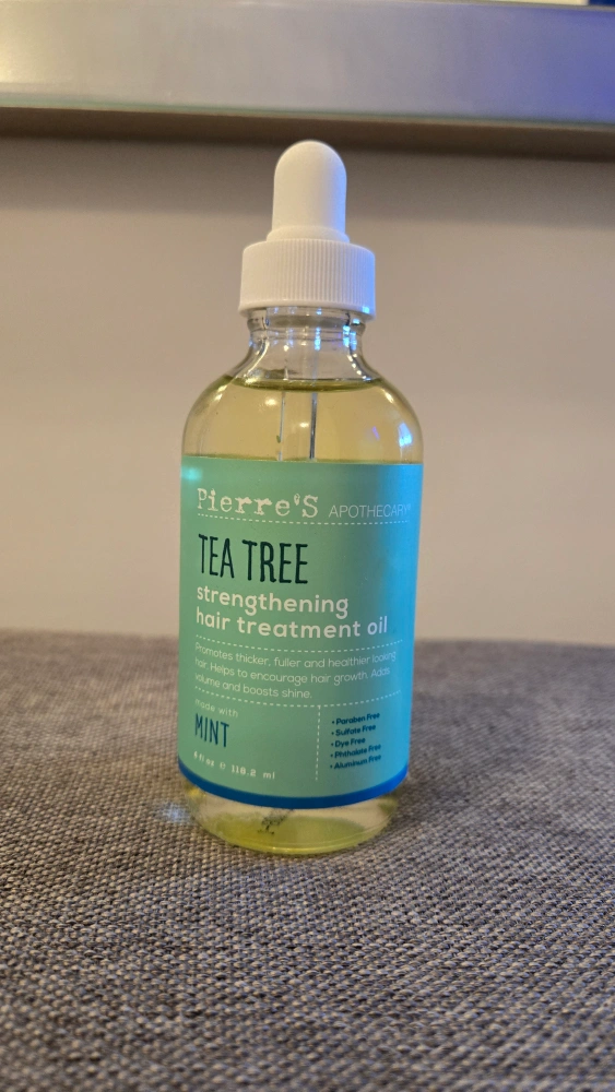 Tea tree strengthening hair treatment oil. Promotes thickening and healthy hair growth. Added mint for shine. Paraben free, sulfate free, phthalate free, cruelty free.