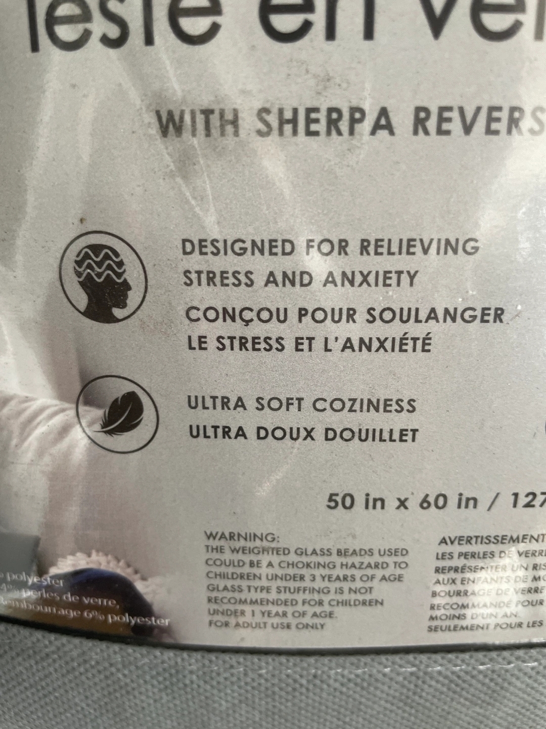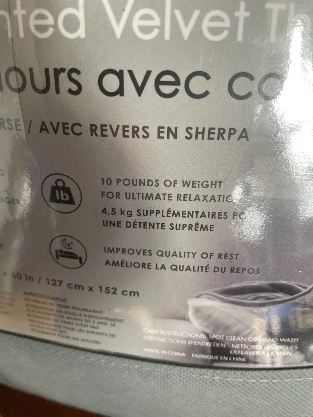 Grey velvet with sherpa reverse. Designed for relieving stress and anxiety. Improves quality of rest. Spot clean or hand wash.