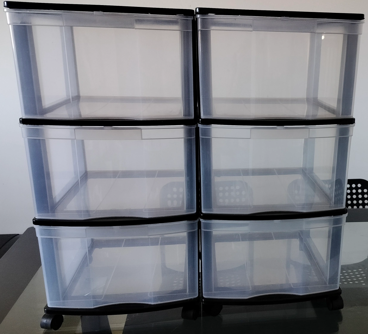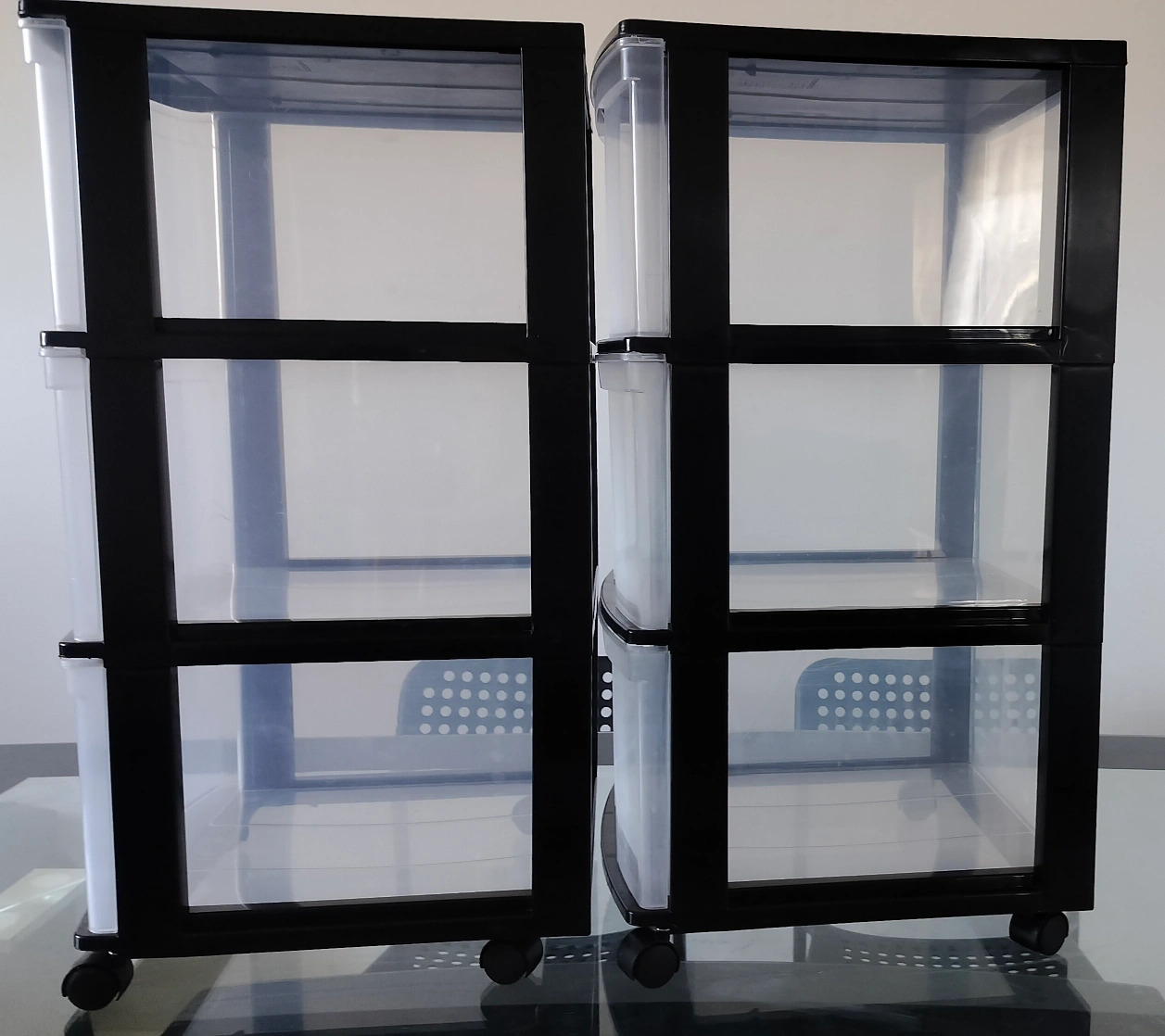 >Two Sterilite 3-drawer carts. Black frames, clear drawers. Good for organizing. On wheels.