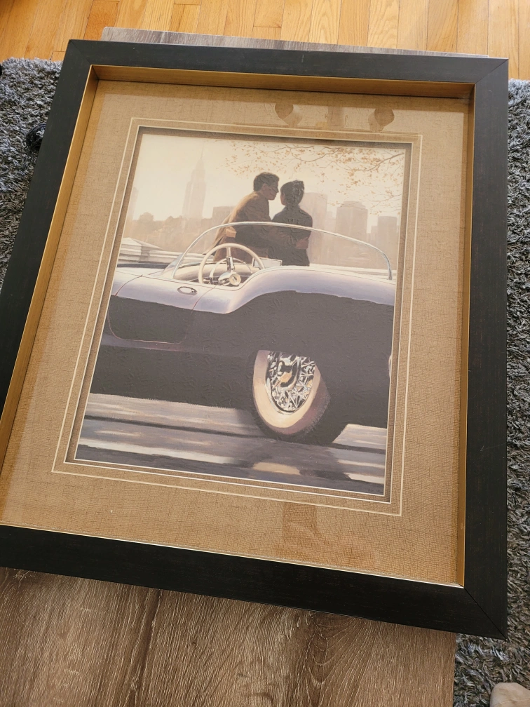 Beautiful framed print. Features a couple in a classic car against a city backdrop. Black frame with gold inner border. Perfect for a lover of vintage cars or romantic art.