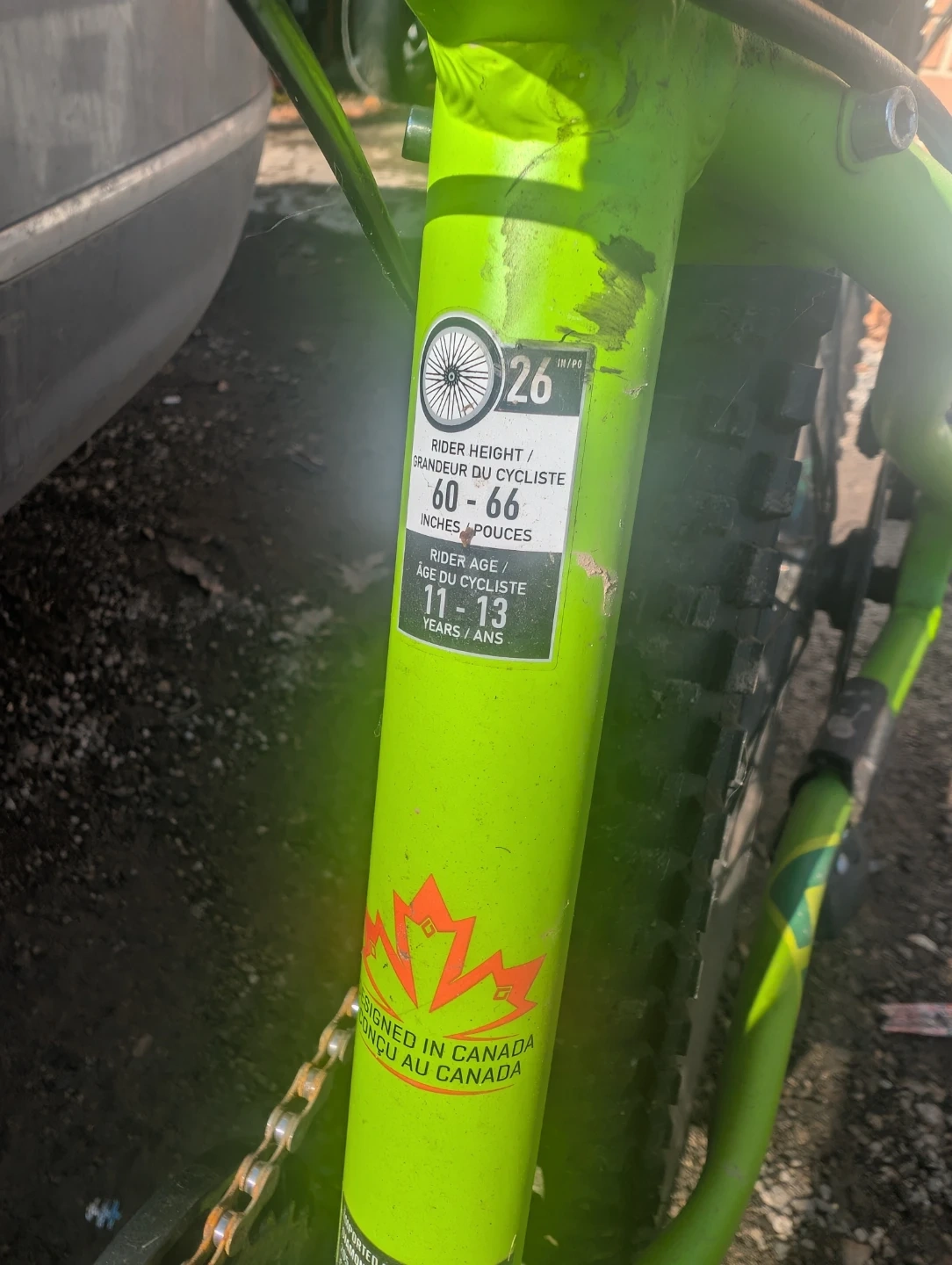 This Diamondback mountain bike has 26-inch wheels and is designed for riders aged 11-13 years. It's suitable for riders with a height of 60-66 inches. This bike was designed in Canada!