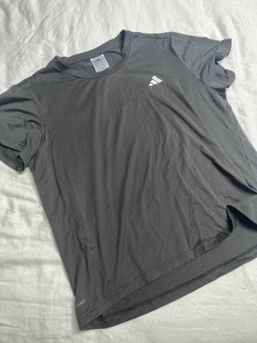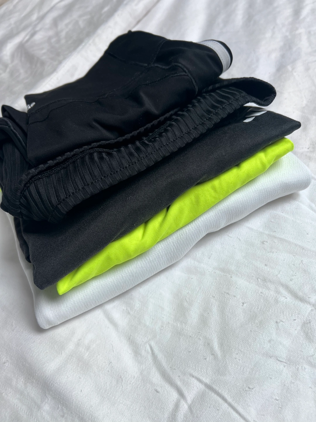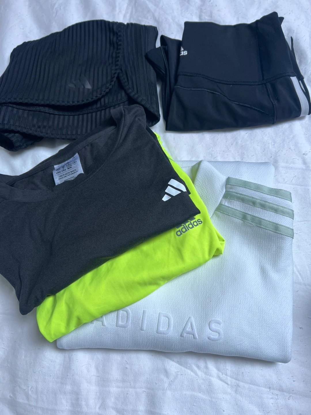 1- size small neon yellow women's running top 2- size small, white long sleeve with sage green stripes and embossed Adidas text on front 3- size medium black womens training top 4- textures running shorts in small with a thick waistband 5- 3/4 length training tights in small with white stripes