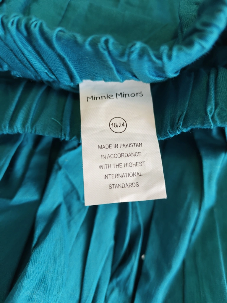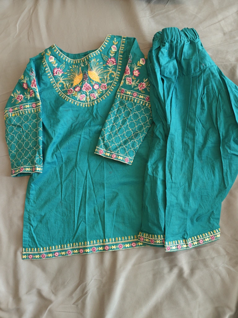 Beautiful teal girls' shalwar kameez. Features embroidered peacocks and floral accents. Three-quarter sleeves. Button closure at the back. Size and material unknown.