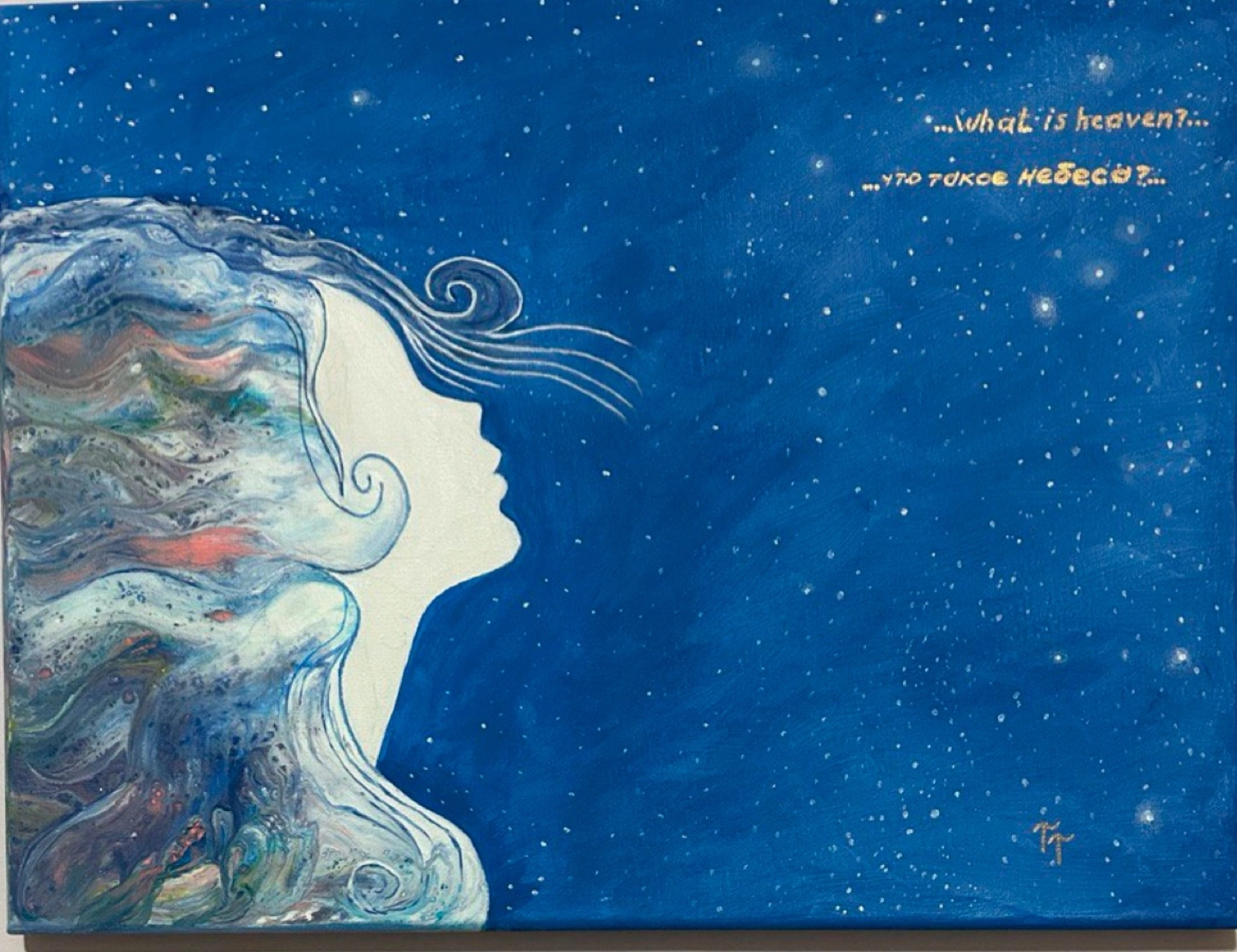 Beautiful fluid acrylic painting. Features a female silhouette against a starry night sky. Includes a quotes. Unique piece, perfect for adding character to your space.