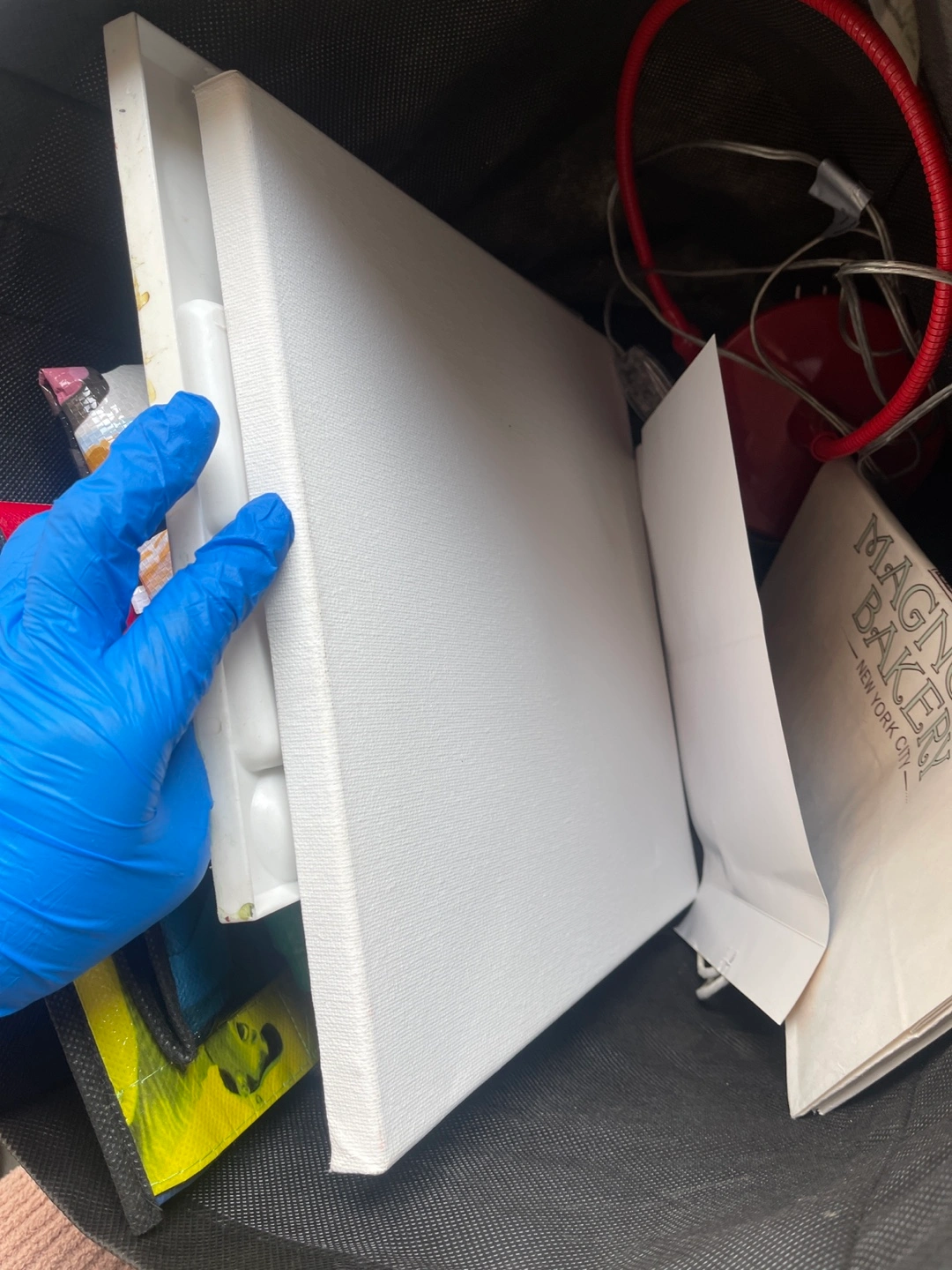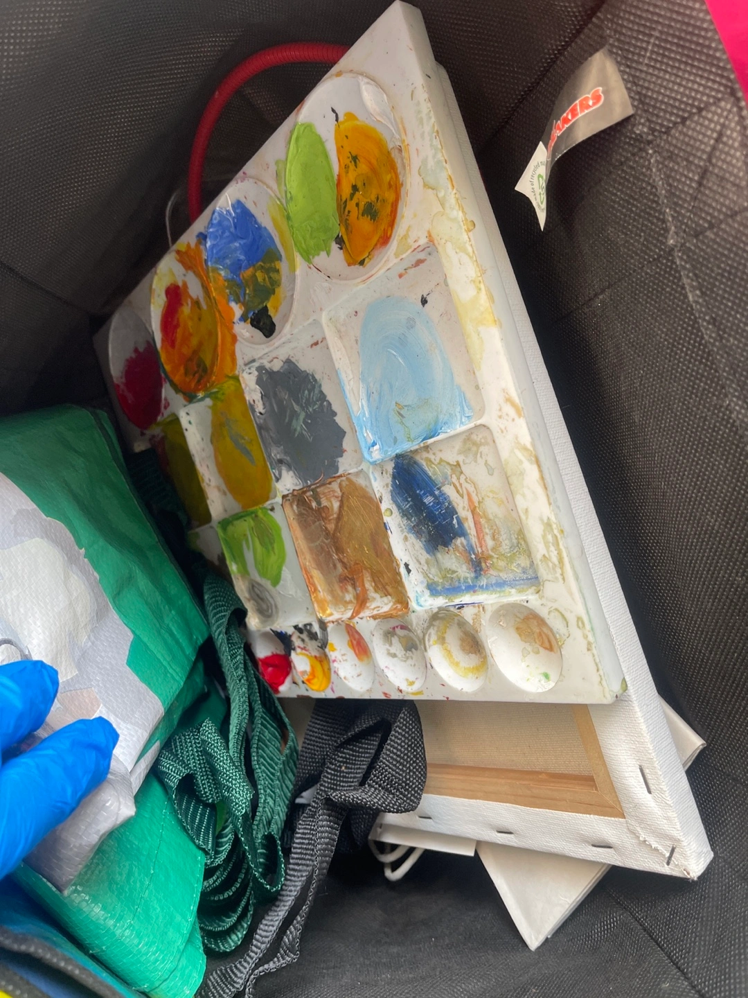 Used artist's paint palette with dried paints. Two stretched canvases. AllBn brand pencil/utility box included. Some minor wear.