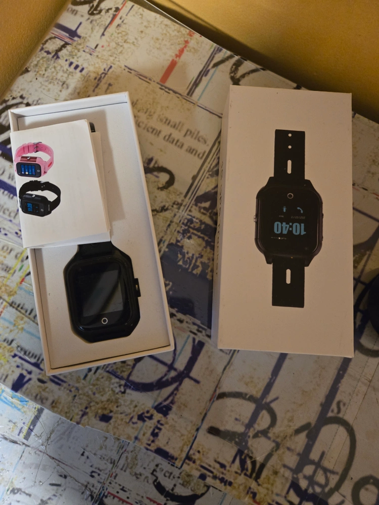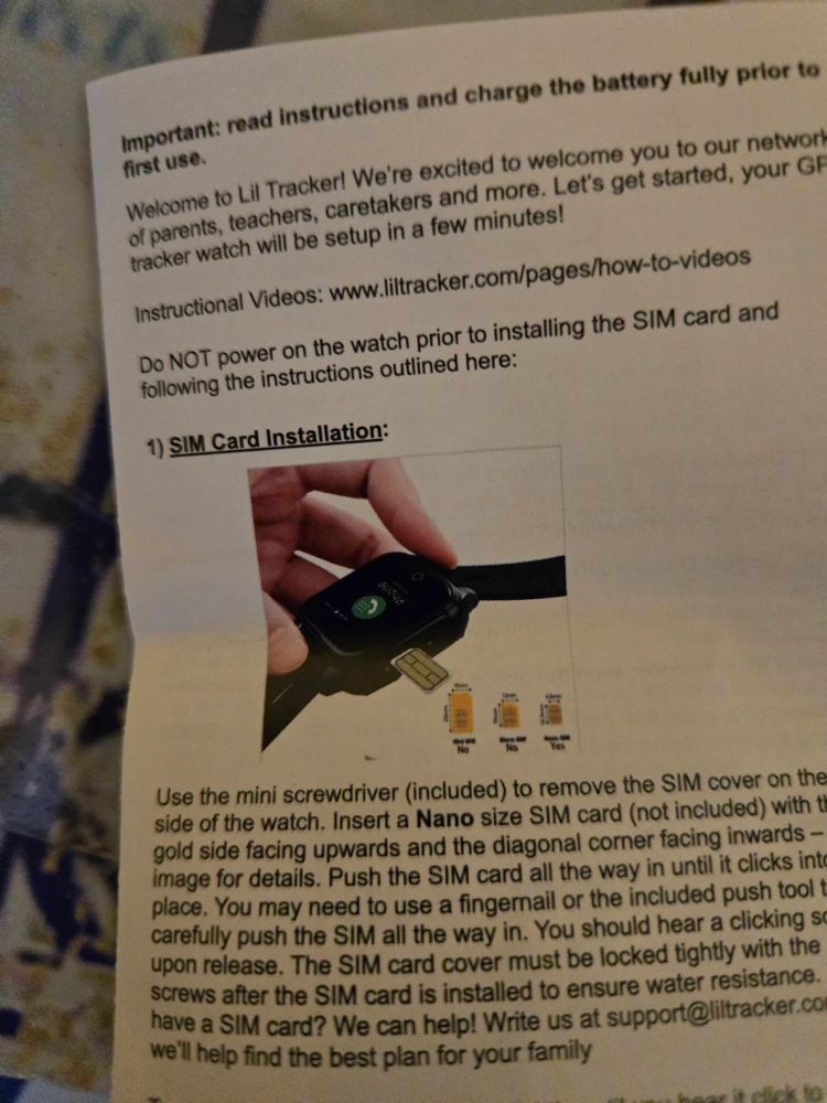 GPS tracker smartwatch for children. Includes instruction manual and SIM card installation details. Black band. New or gently used. + wireless charger( bought separately)