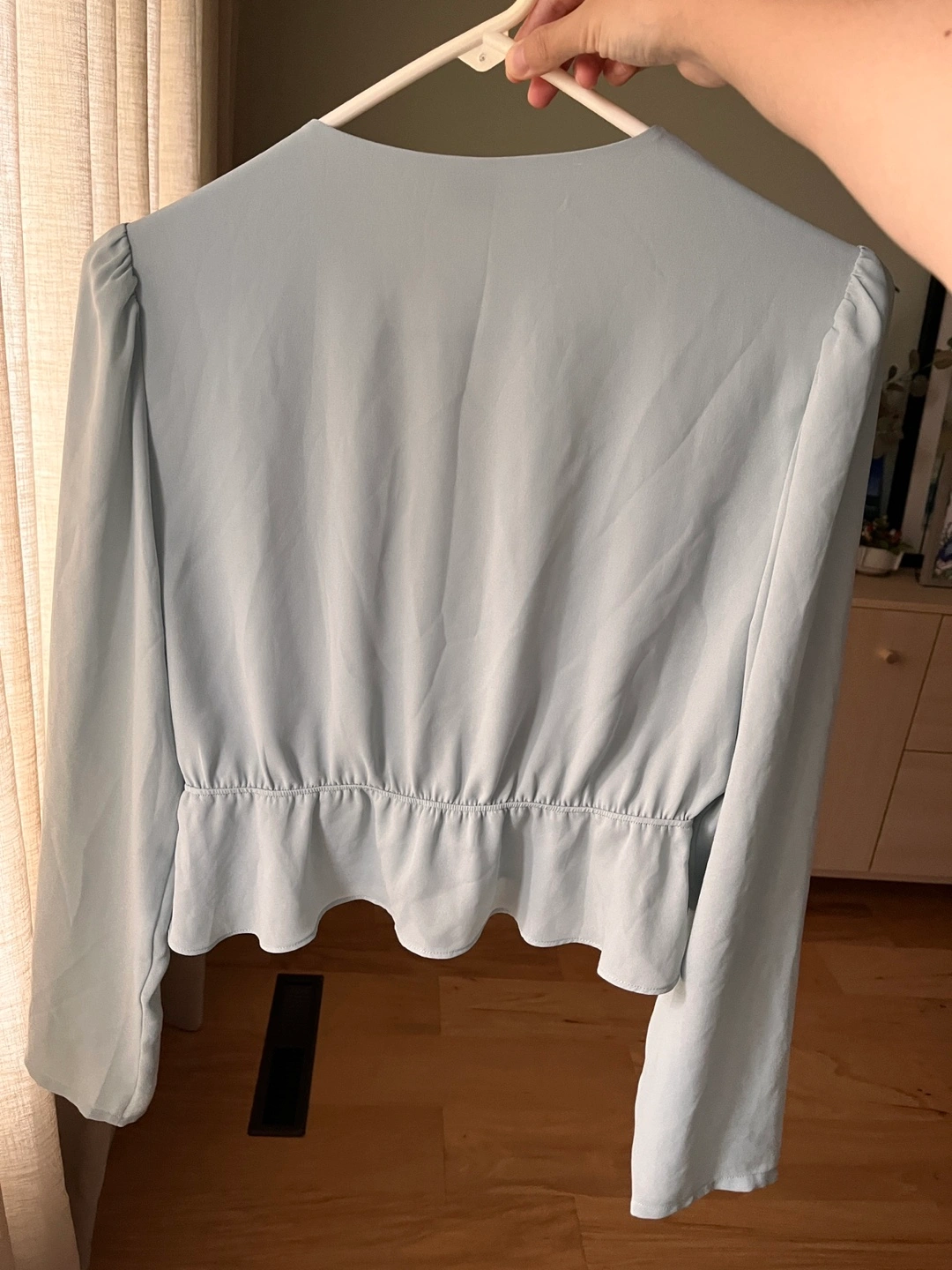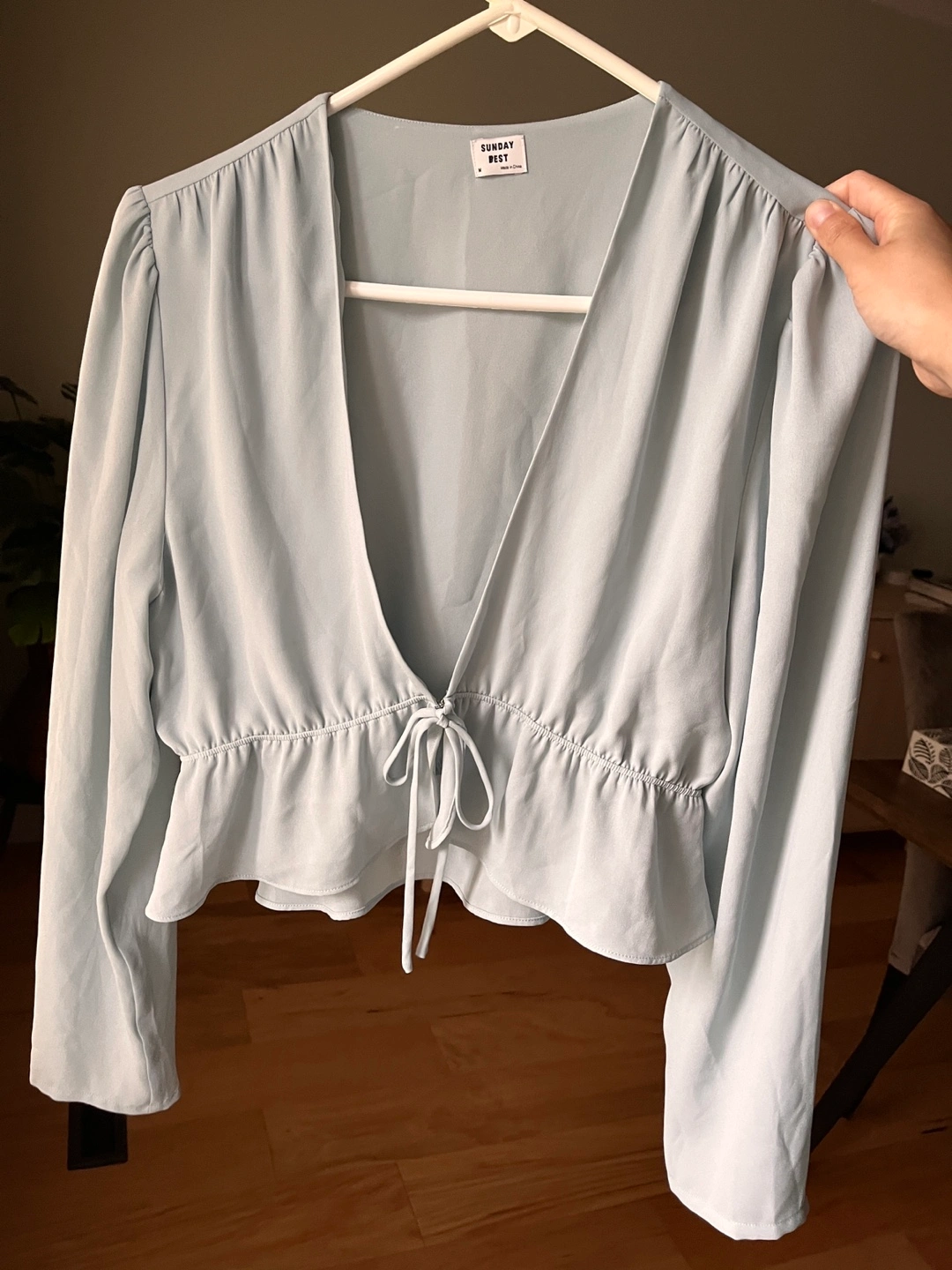 Beautiful light blue crop blouse. Long sleeves, V-neck, tie front. Scalloped hem. Size medium. Excellent condition.