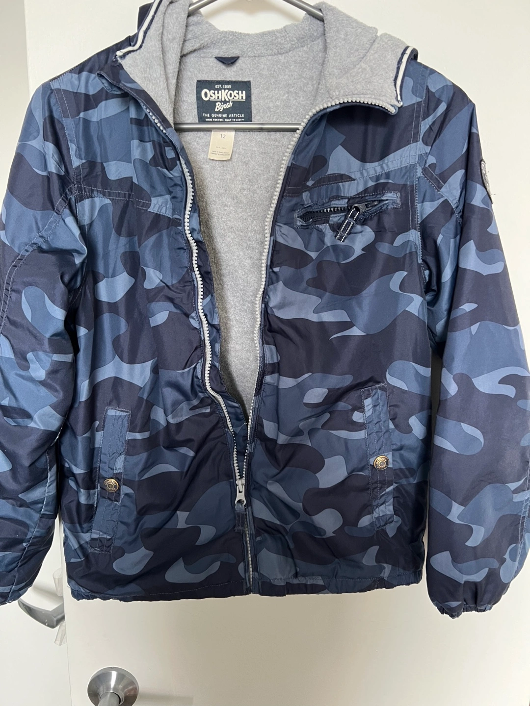 Boys' size 12 camouflage jacket. Features a zip-up front, hood, and fleece lining. Great for fall or spring.
