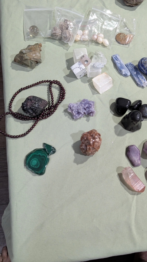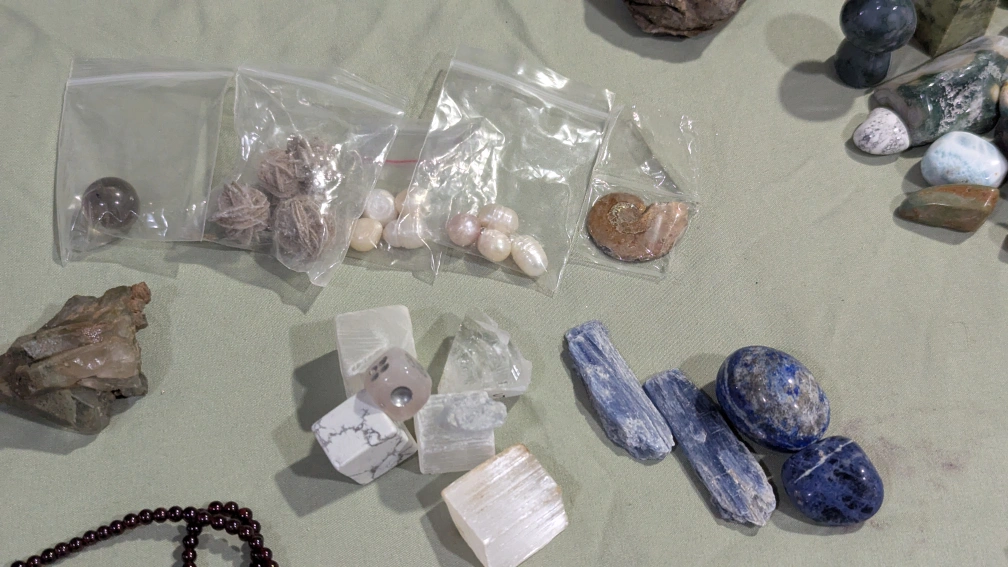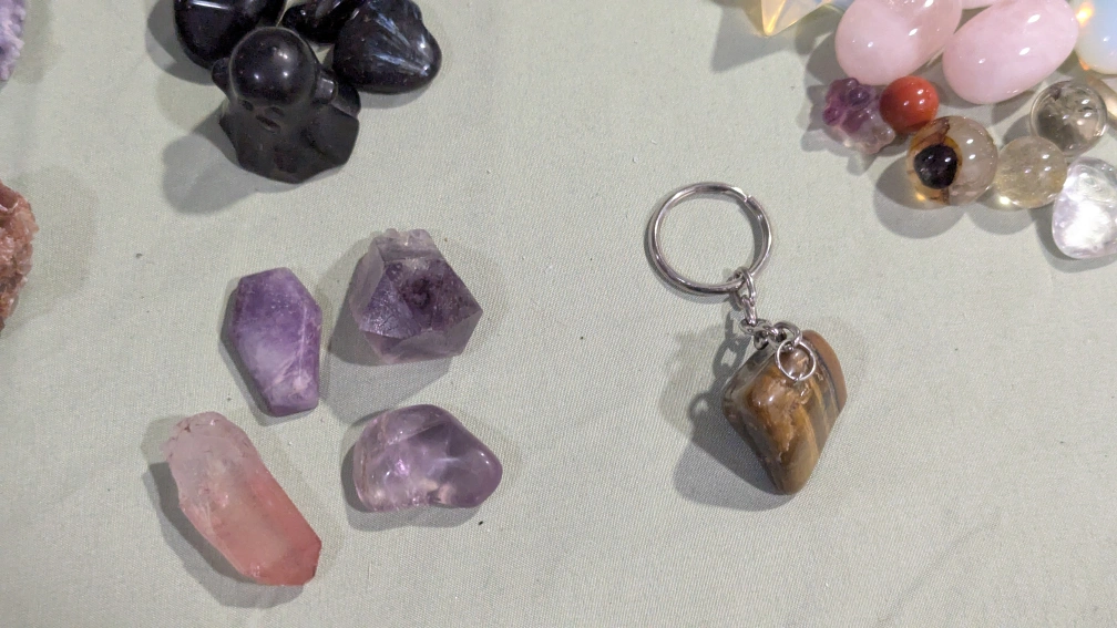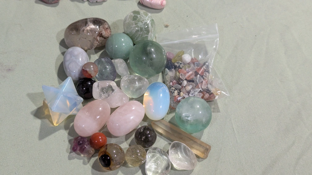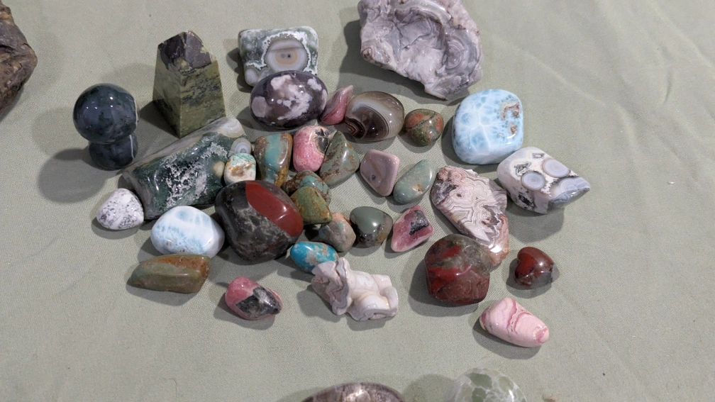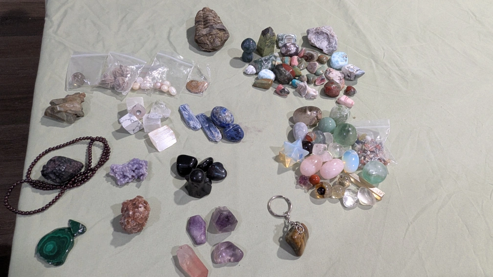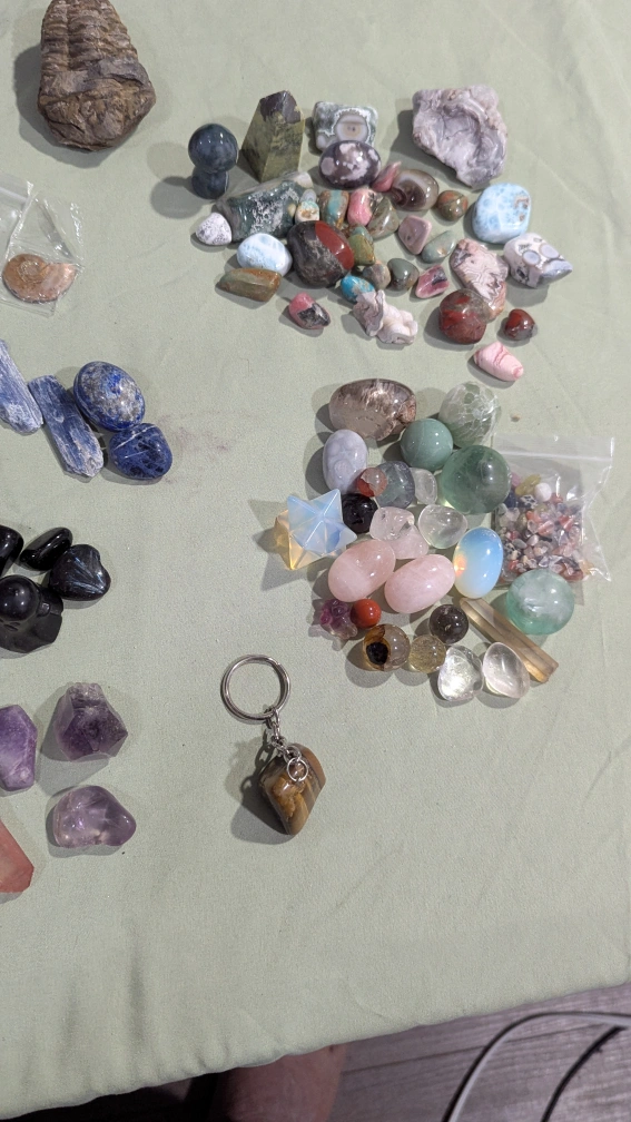 Large Collection of Tumbled Stones, Crystals, and Keychains