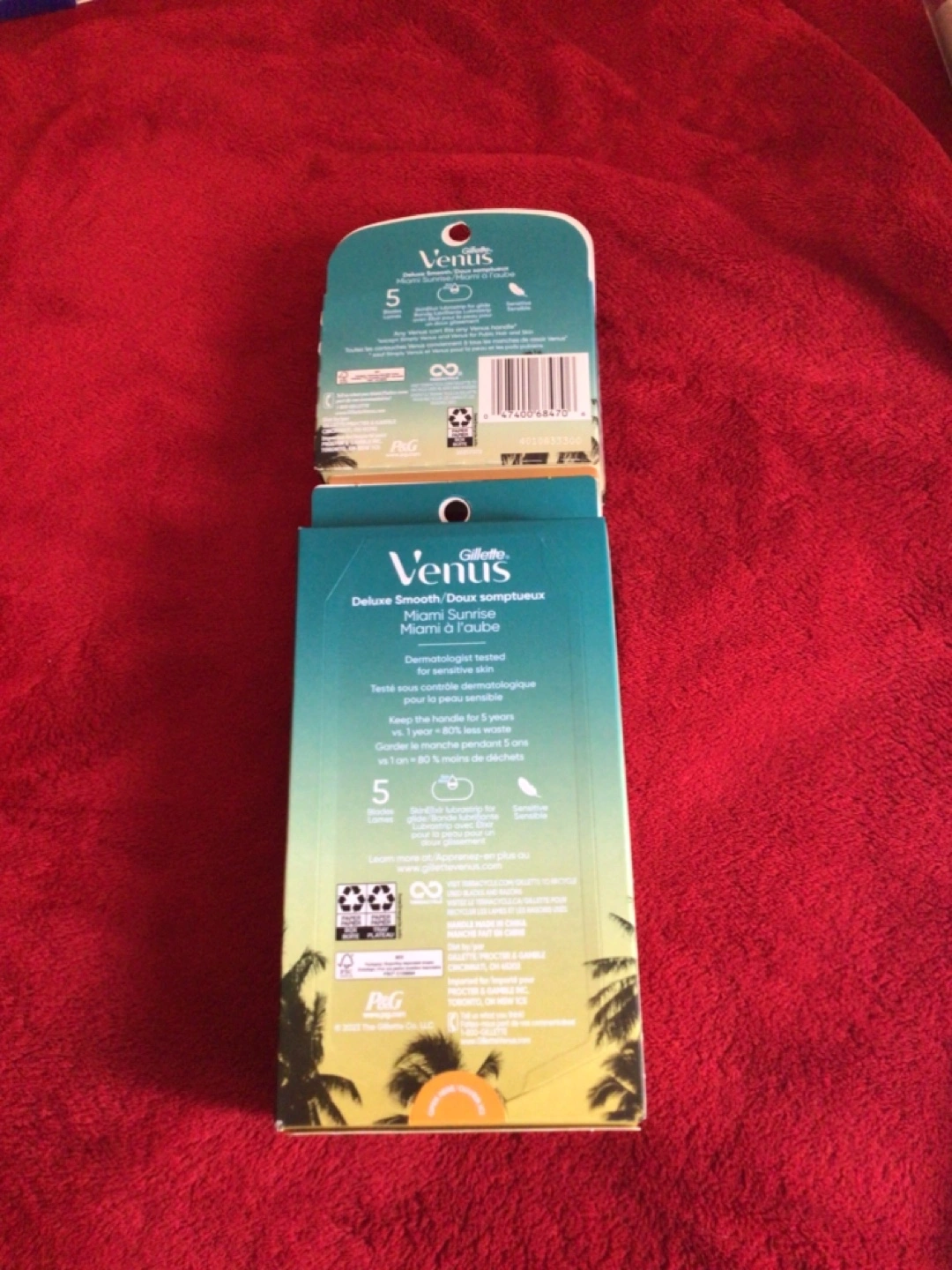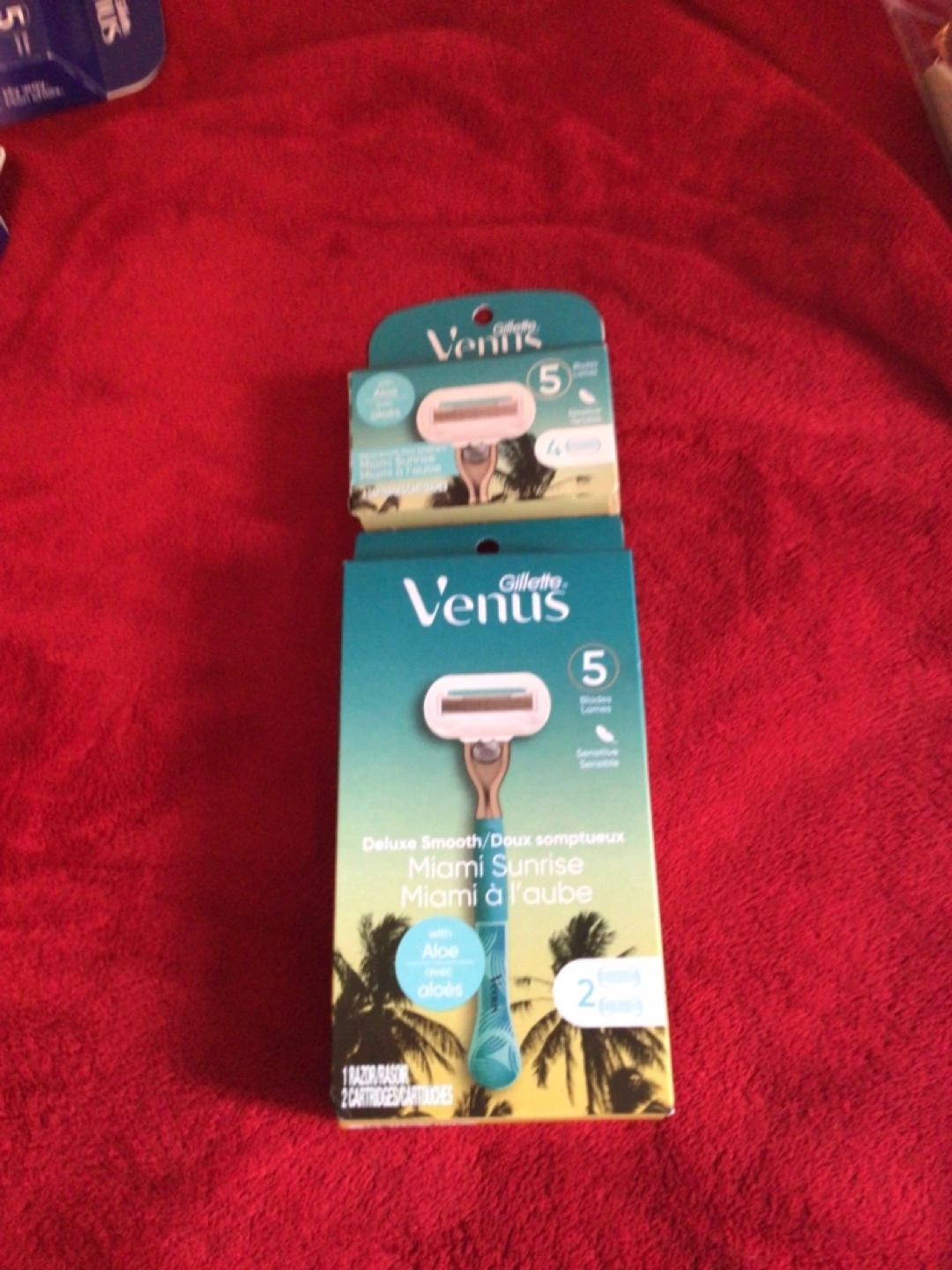 New, unopened package of Gillette Venus razor blades. Miami Sunrise scent. Five blades per cartridge. Two cartridges included. Designed for sensitive skin. Aloe vera added.