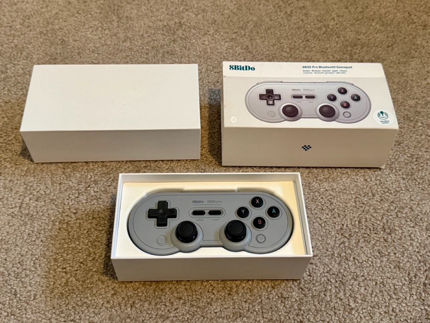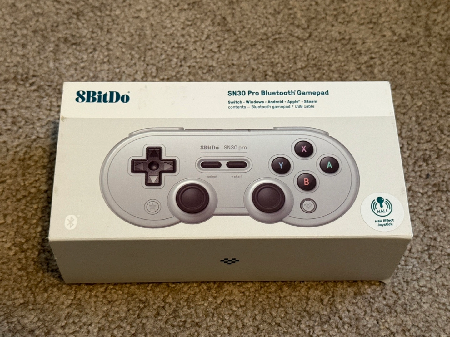 Brand new, unopened 8BitDo SN30 Pro Bluetooth gamepad. Compatible with Switch, Windows, Android, Apple, and Steam. Includes USB cable. Hall effect joysticks.
