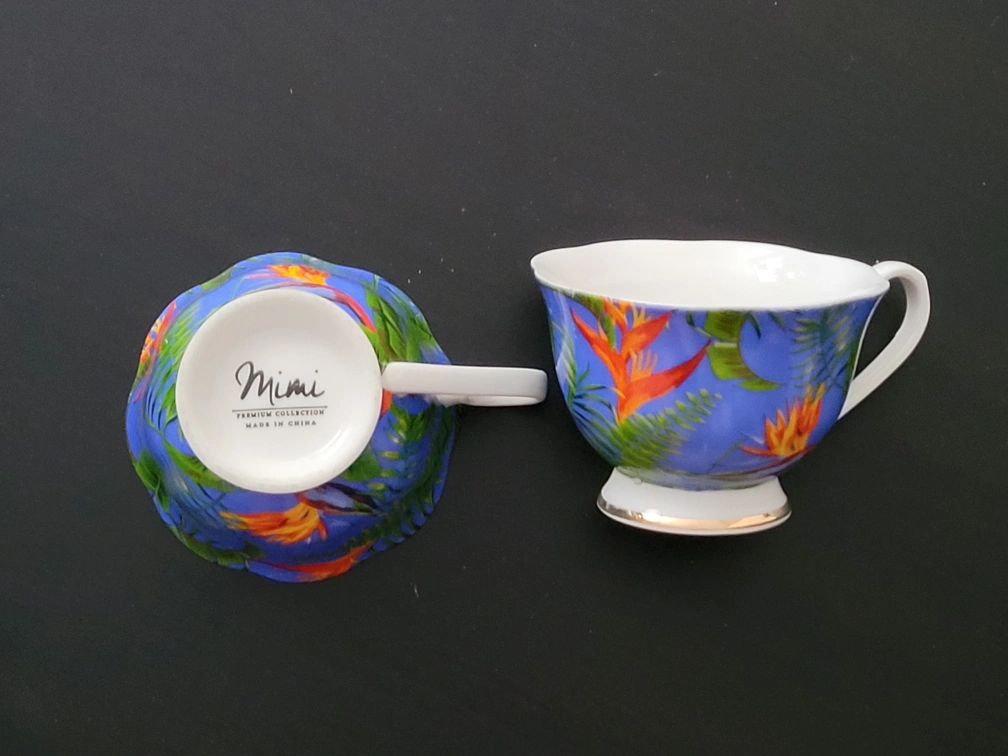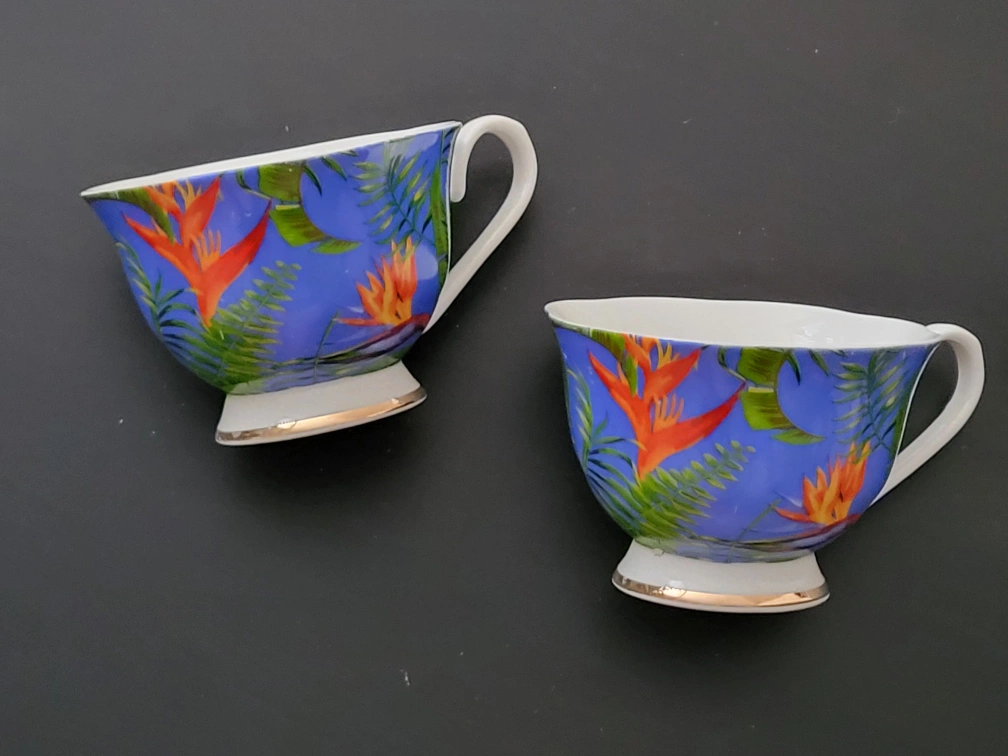 Pair of teacups. Blue background. Tropical bird of paradise flower print. Gold detailing at the base. Made in China.