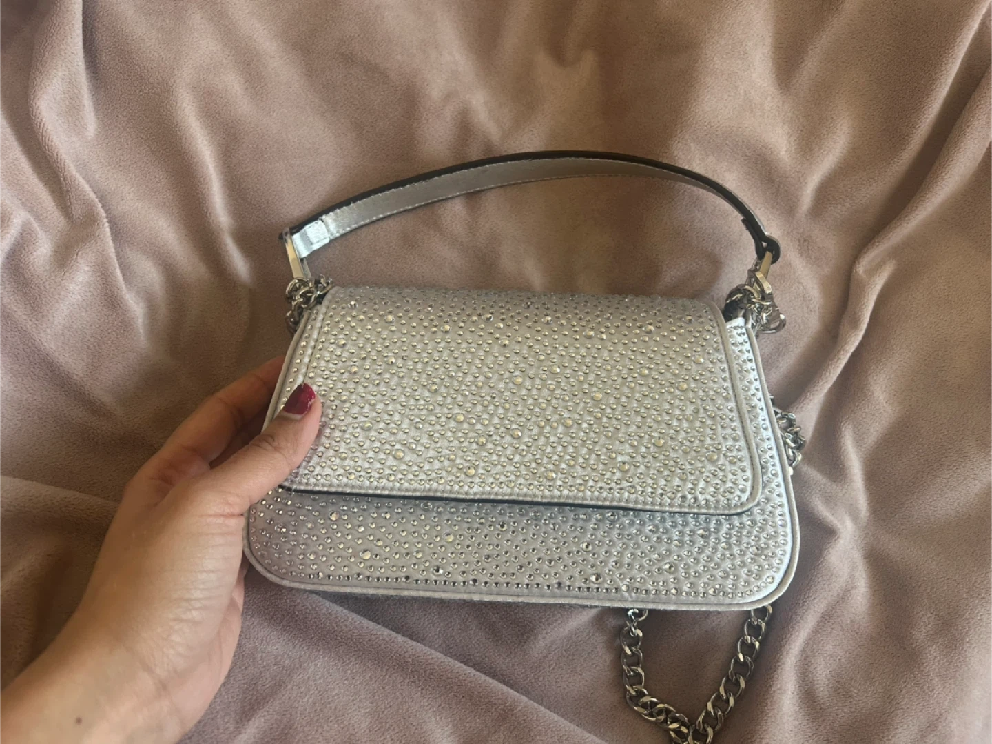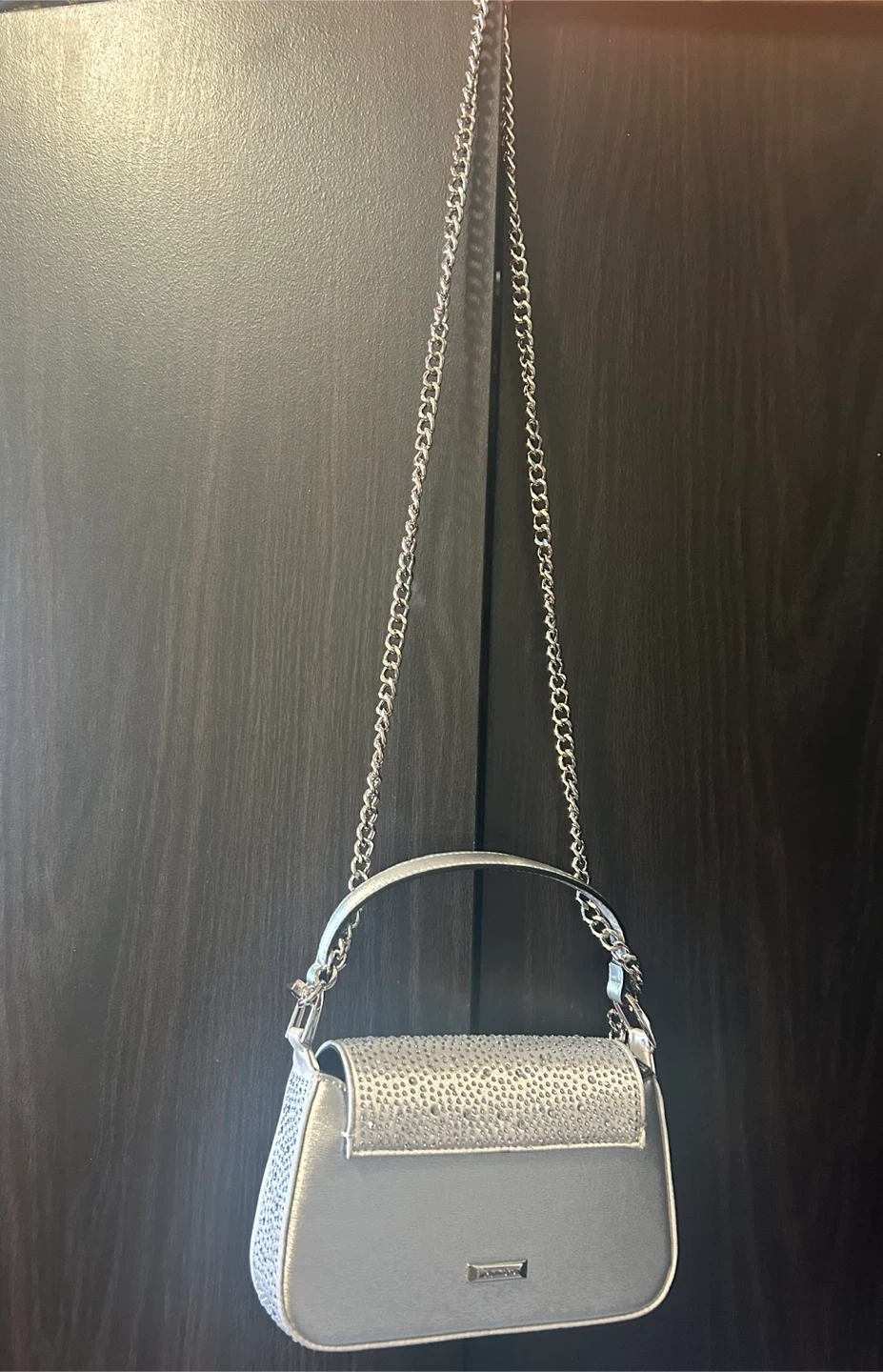 This is a sparkly silver shoulder bag from Aldo. It features a chain strap and is adorned with rhinestones on the flap. The interior has a card for delicate details.