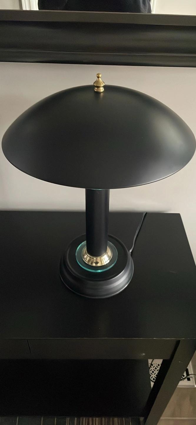 Features a dome shade and a cylindrical base. Glass accents. Excellent for a retro or minimalist aesthetic. Touch on/off