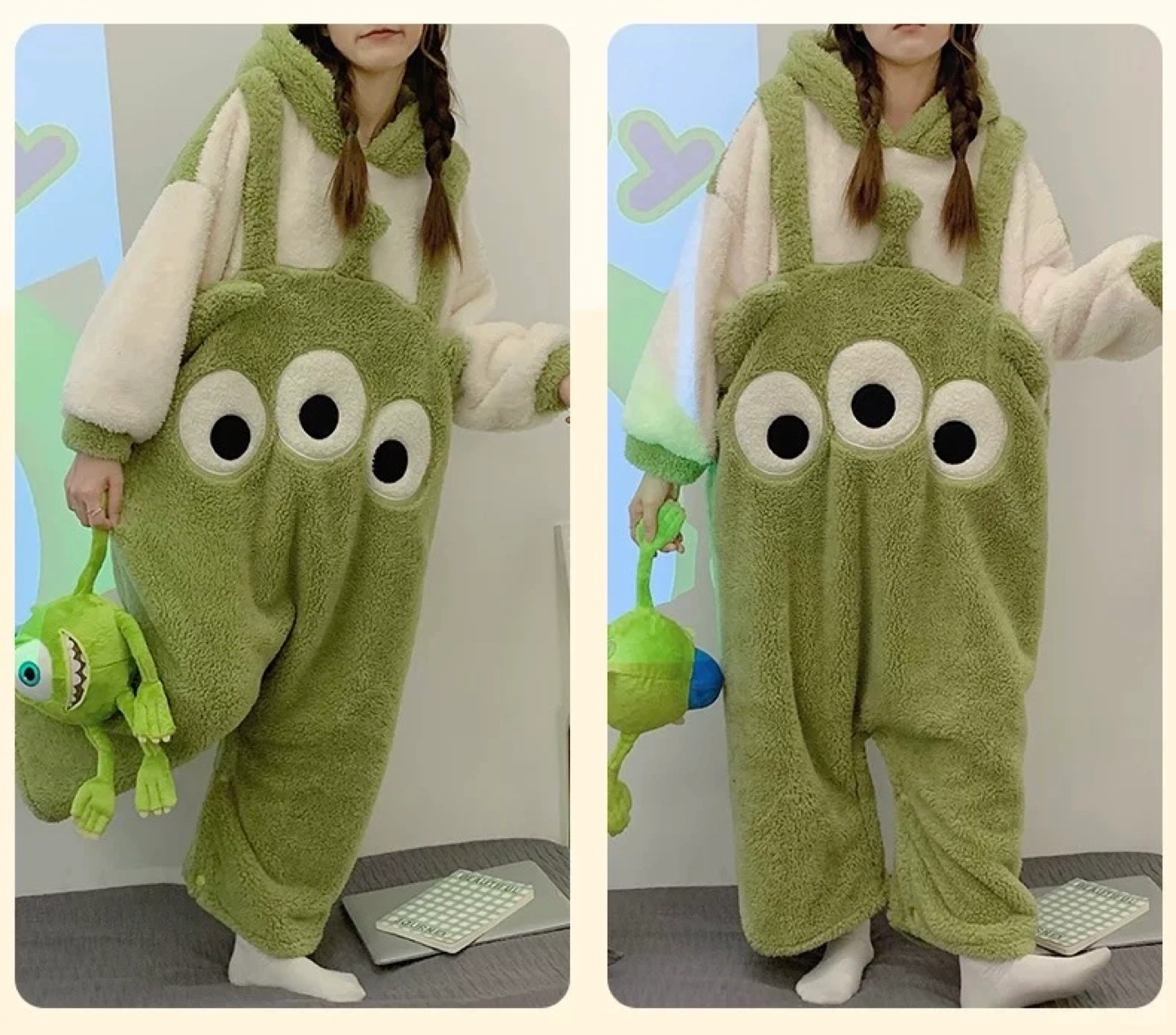 Super soft green fleece onesie. Features a hooded design and three-eyed alien design. Perfect for lounging around the house.