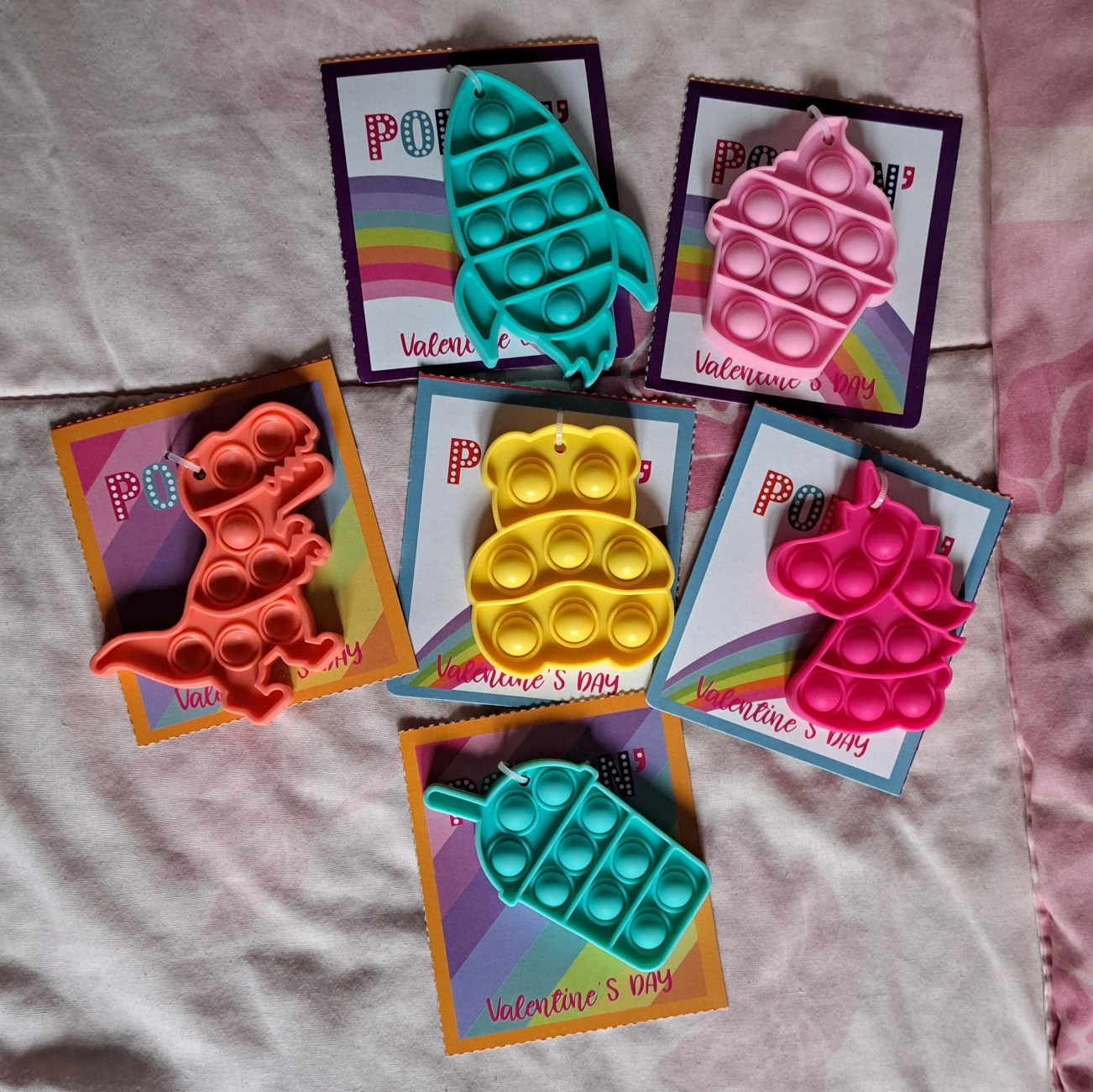 Six silicone mini pop-its. Can put it on a Keychain. Various colours and shapes. Includes dinosaur, rocket, bear, cupcake, unicorn, and bubble tea. Brand New!
