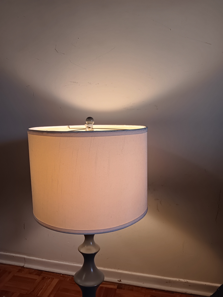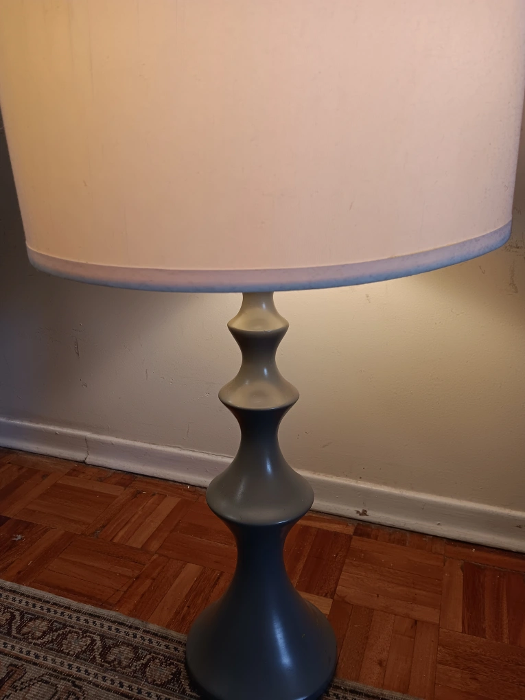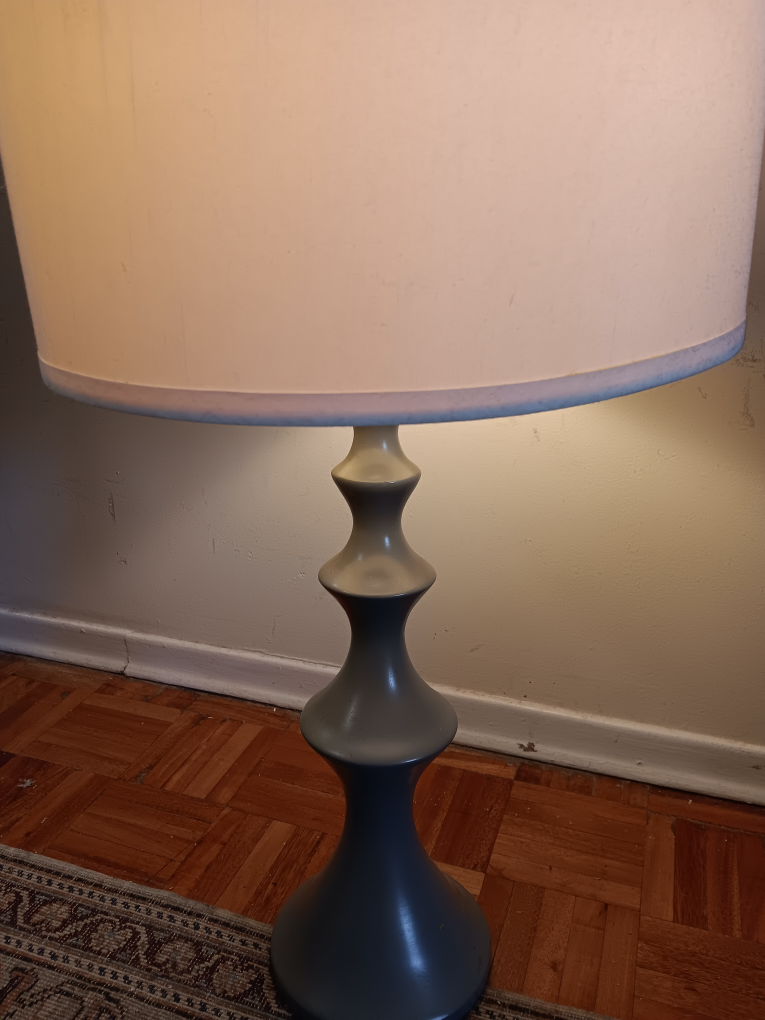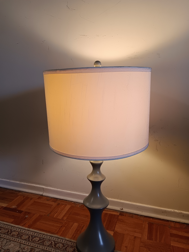 Stylish table lamp. Features a grey ceramic base and off-white fabric shade. Great for a living room or bedroom. Adds a touch of retro charm to any space.