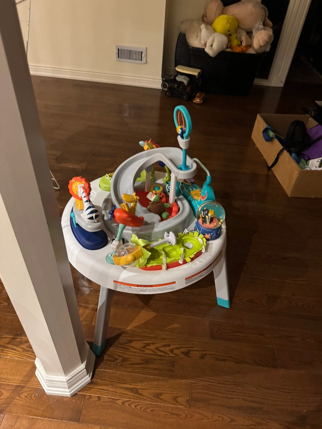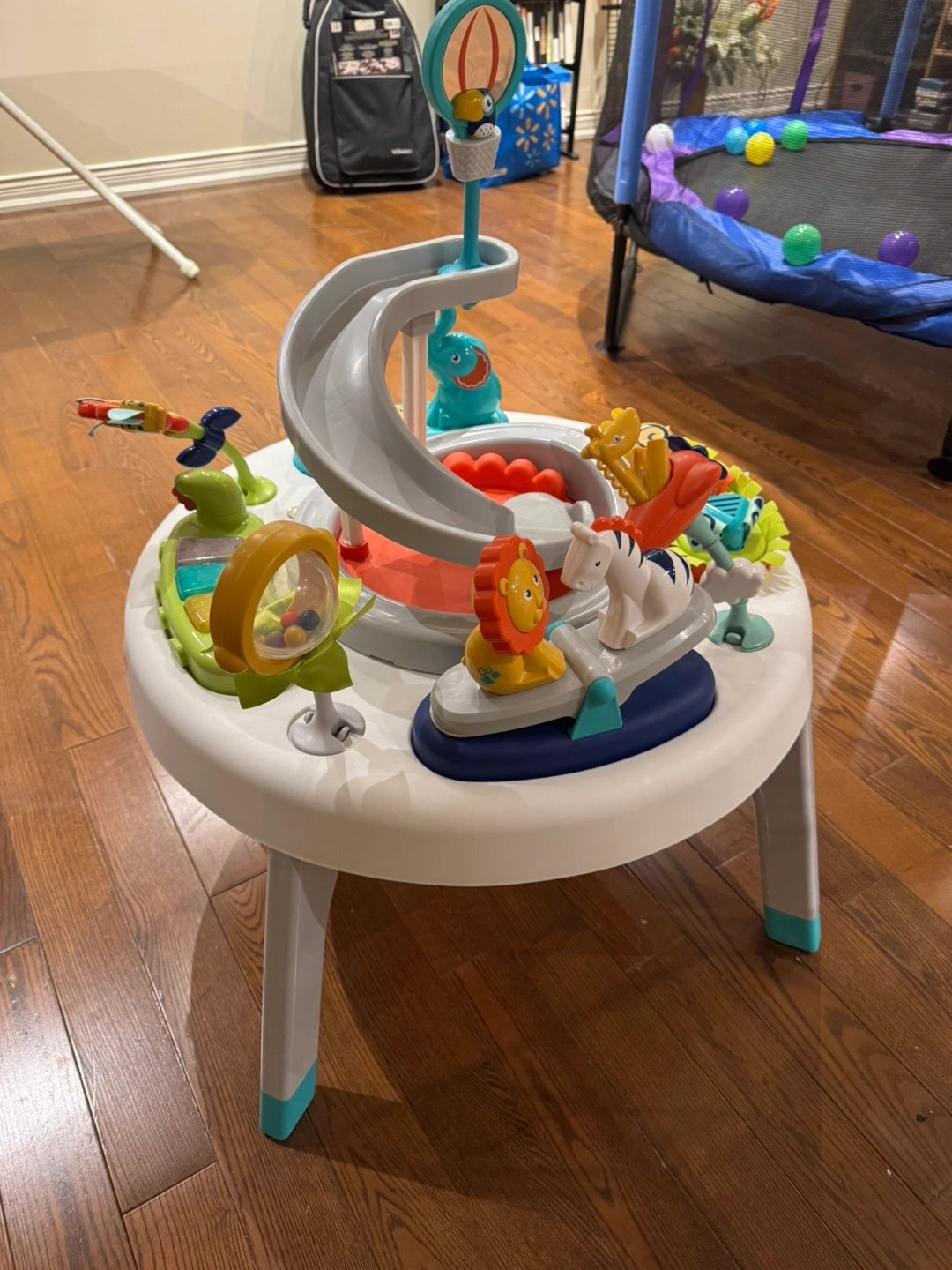 Interactive play table. Features a slide, spinning animals, and other activities. Great for babies and toddlers. Fun and engaging.