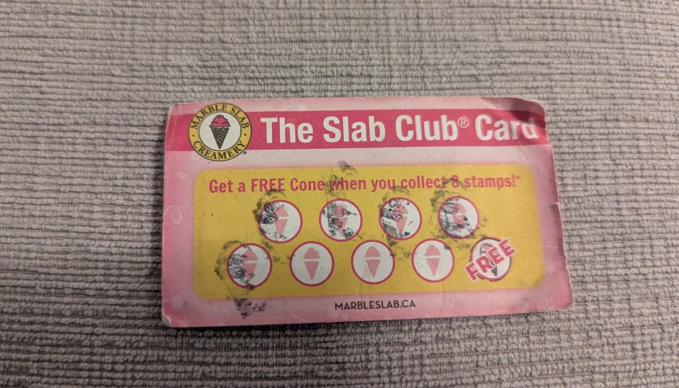 Vintage Marble Slab Creamery loyalty card. Collect 8 stamps for a free cone. Shows wear.