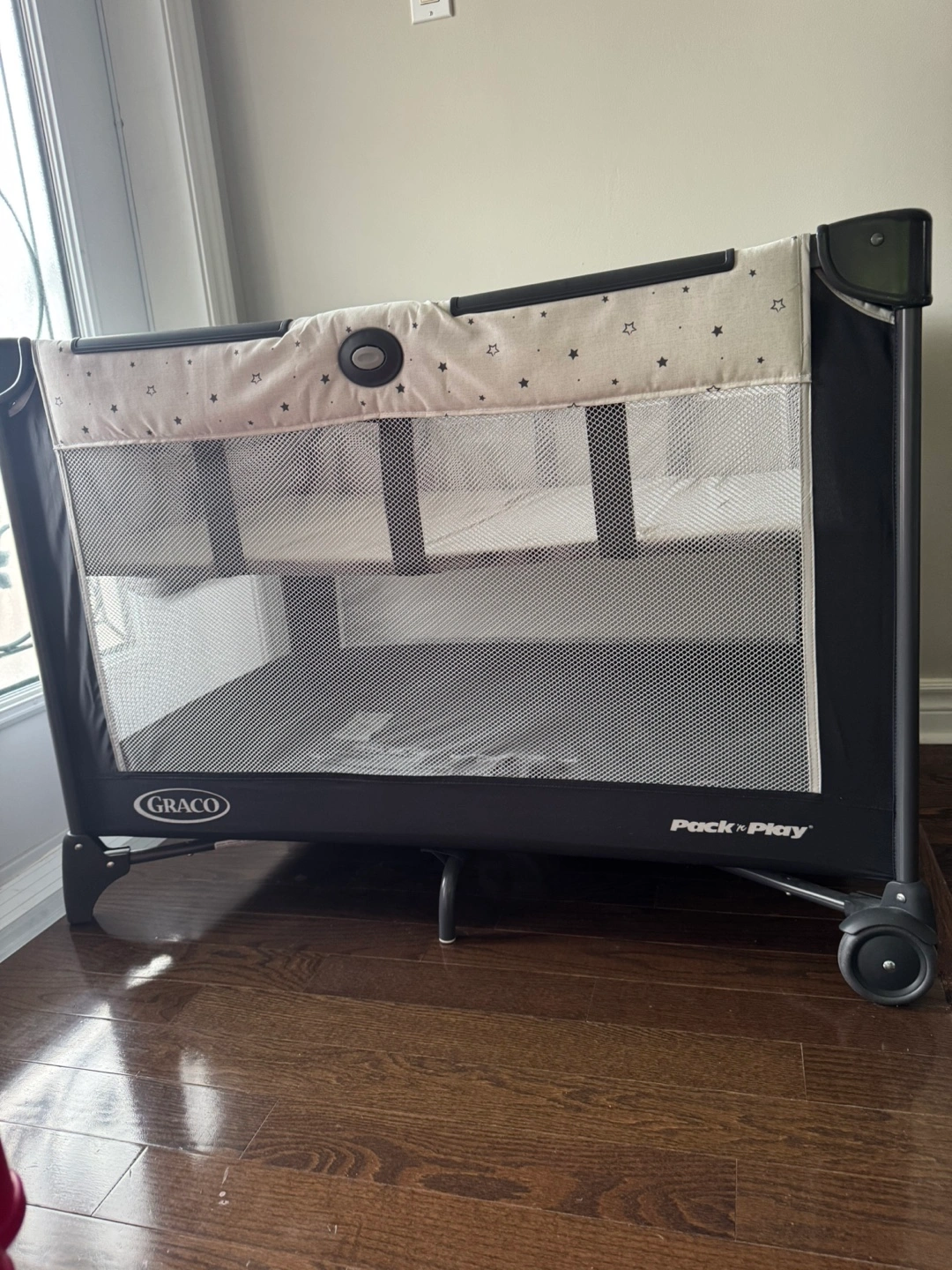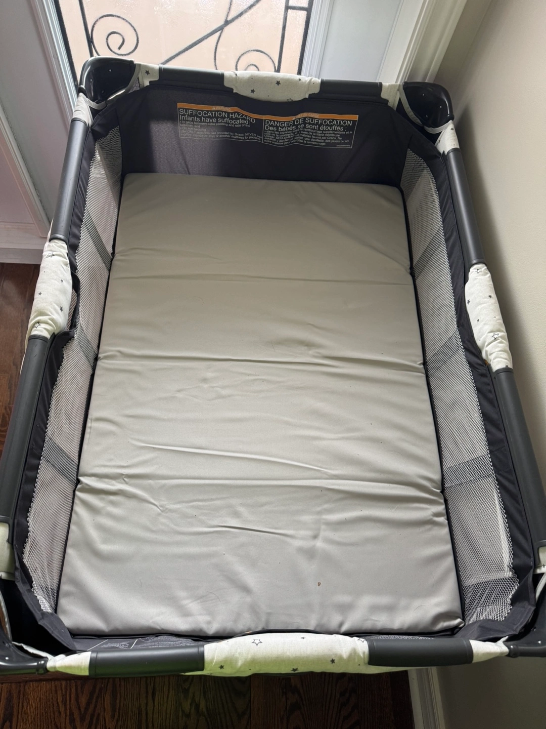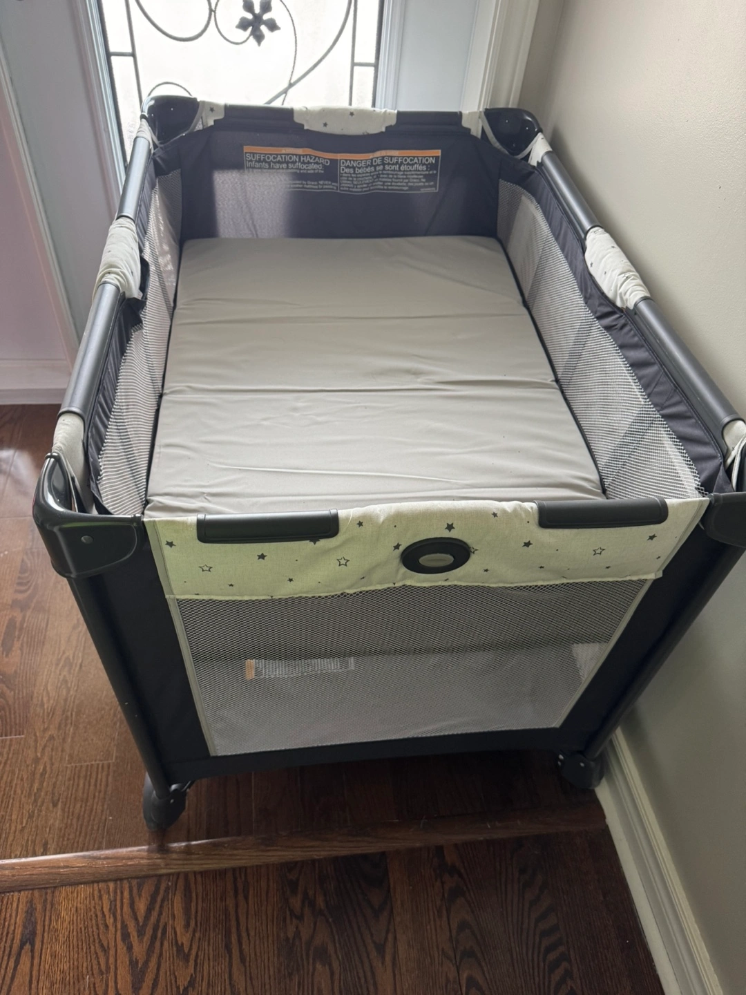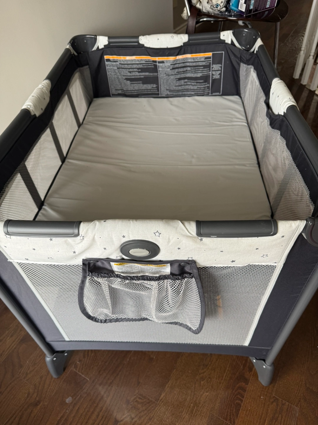 Removable bassinet, turns into a playpen. Easy to put together and take down.