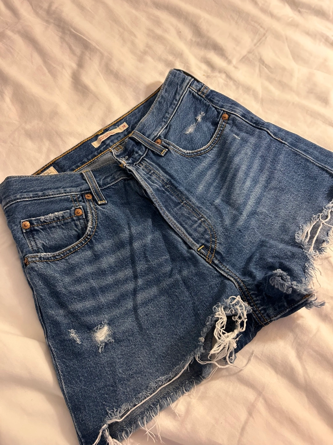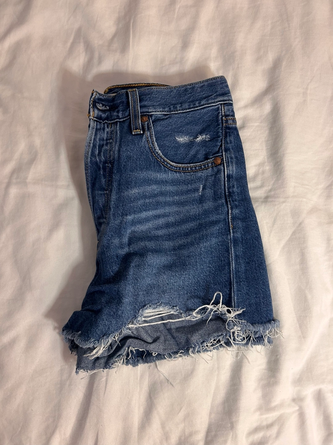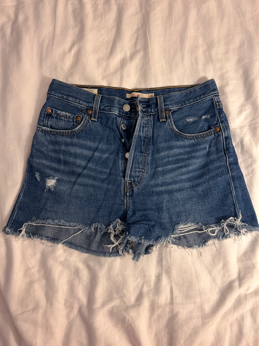 Women's Levi's 501 short denim shorts. Size 28. Distressed hem. Classic 501 styling. Excellent condition.