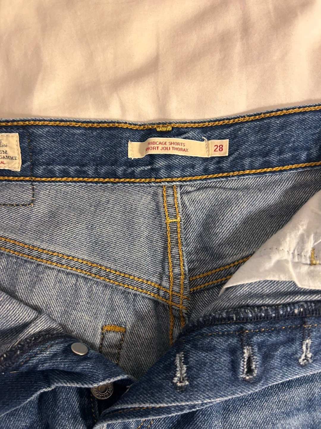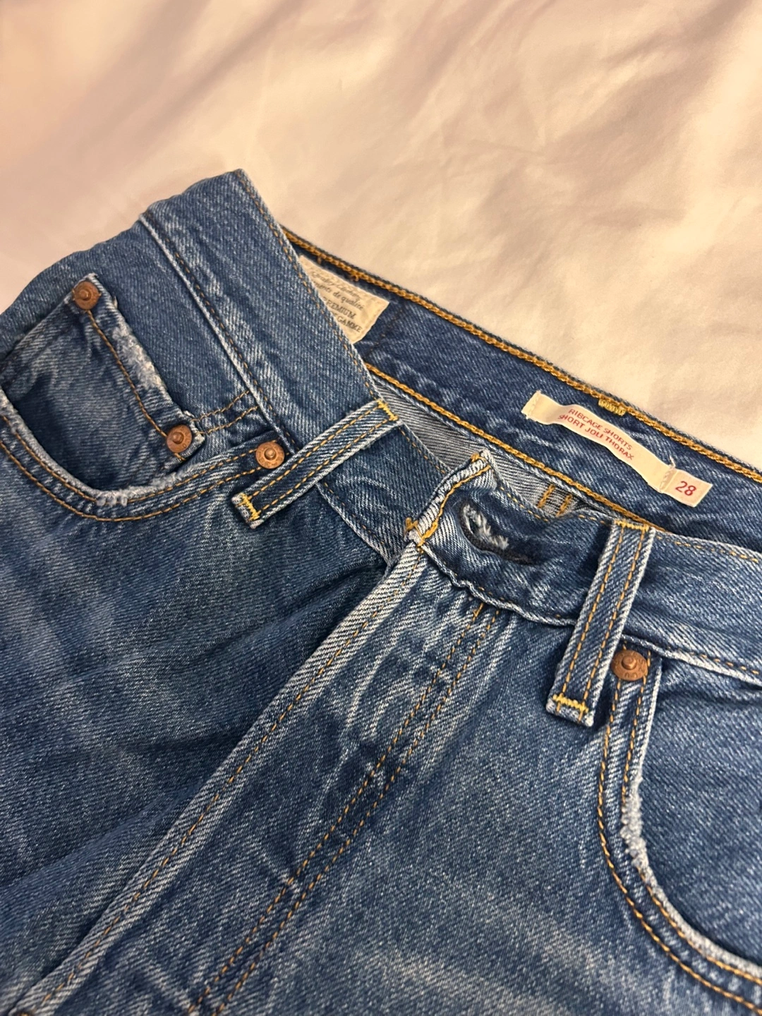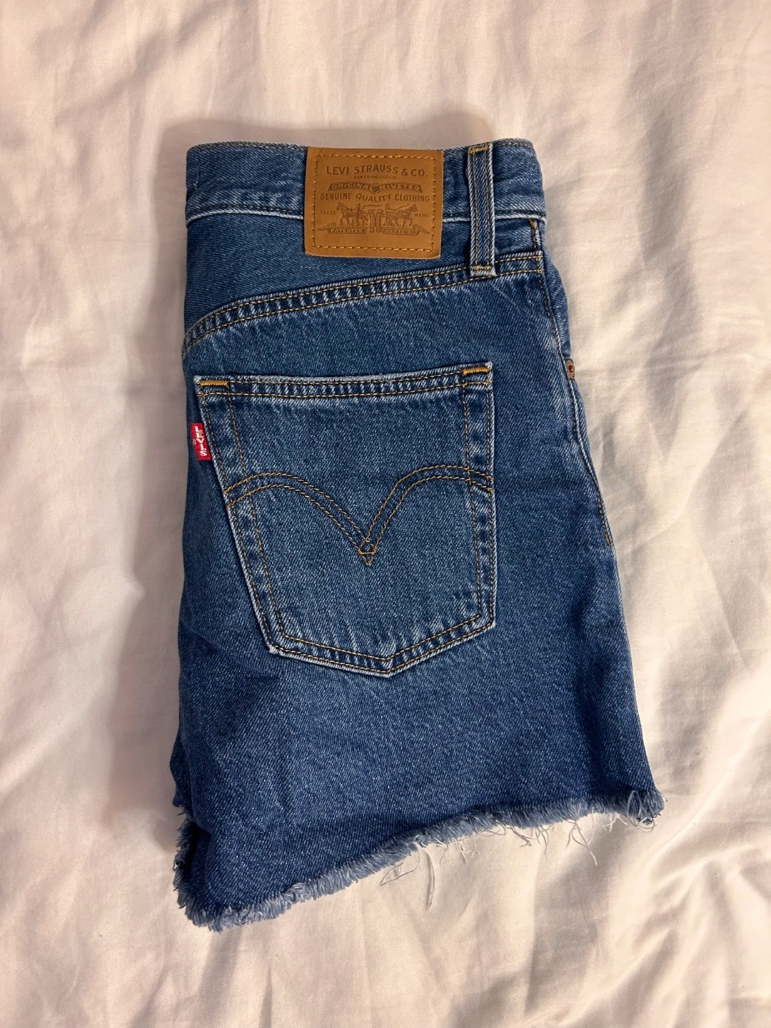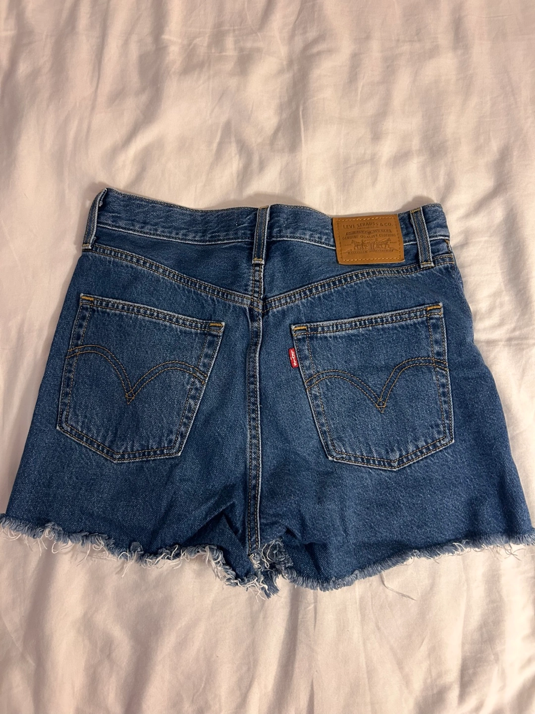 Women's Levi's 501 short denim shorts. Size 28. Distressed hem. Classic 501 styling. Excellent condition.