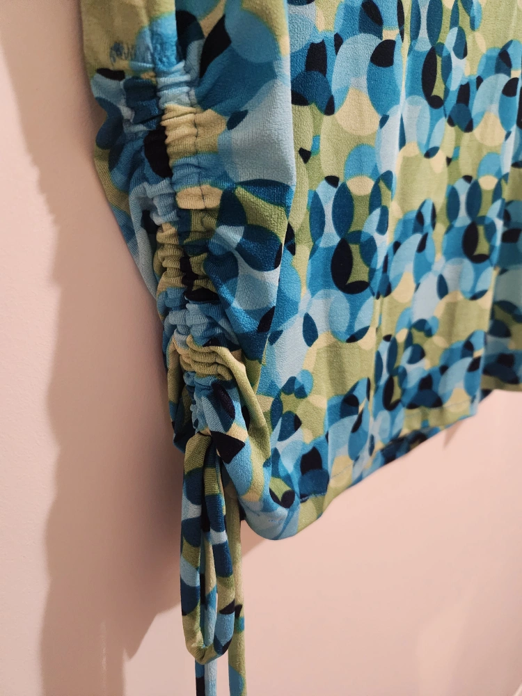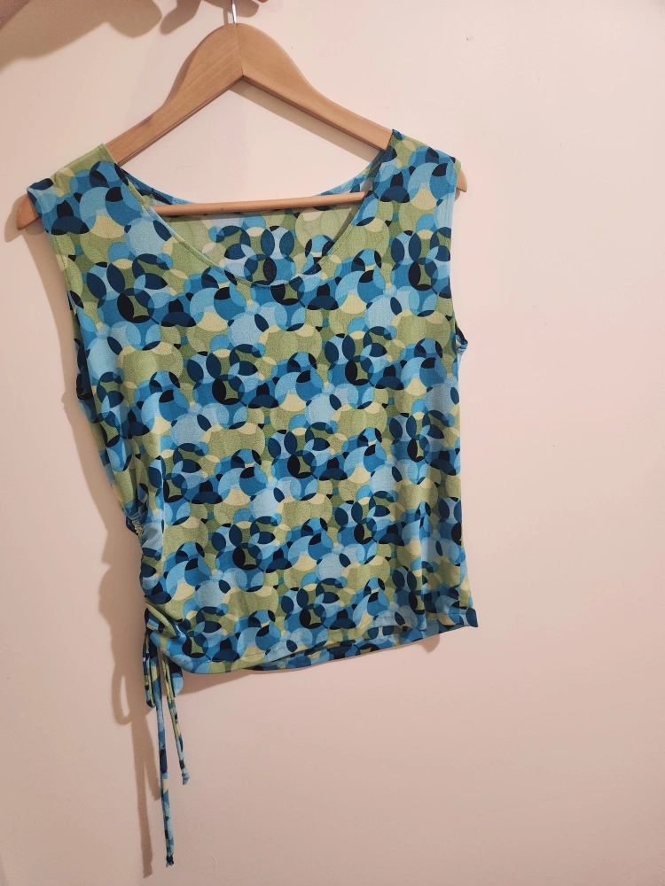 Fun sleeveless top. Geometric circle print in blues and greens. Ruched side detail. Cool and light material. No tag but fits like a medium Pickup near Bayview station or Yonge and Sheppard